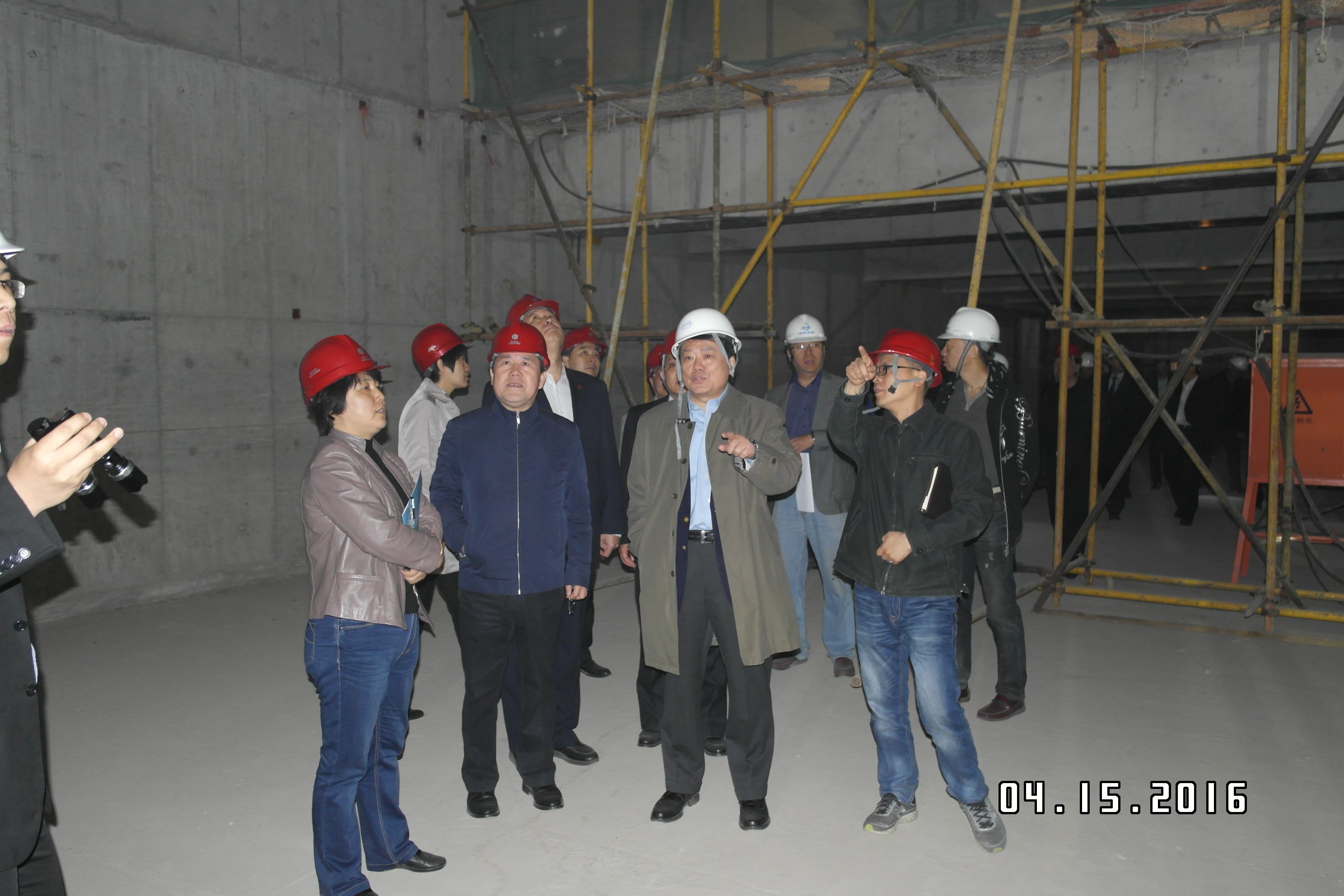 2016年4月15日上午,秦亚青院长带领学院领导班子成员视察展览路校区地下停车场及运动场项目(简称地库项目)施工现场;院办、党办、后勤办、保卫处主要负责同志、基建处全体工作人员、项目管理公司、监理公司、造价审计单位、总承包单位主要负责人陪同视察。