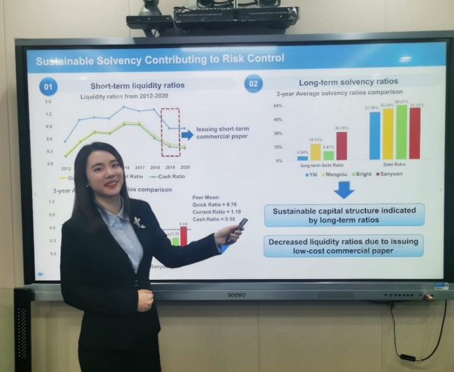 本次比赛的标的公司为伊利股份(600887.SH),为食品饮料行业的白马股,该公司具有很高的分析师覆盖率。如何解读分析海量的信息和观点、形成独特的研究视角,并得出有价值的结论成为本次研究的难点。同学们从全面的搜集信息开始,不仅详细阅读了公司网站、历年年报季报和投资者关系活动记录,还阅读了海量的行业研究报告及头部券商和研究机构出具的公司深度研究报告,以求深度了解行业各细分领域的商业逻辑及公司本身的盈利模式和财务特征。通过反复讨论,同学们确定了从产品、品牌和渠道三个维度去论证伊利的竞争优势,并从商业模式、财务、估值和ESG四方面去梳理对比伊利及其同行业竞争对手的定性和定量特征,形成了事实案例丰富、数据基础详实的最终研究报告,并设计制作了长达130页的精美PPT演示文稿。