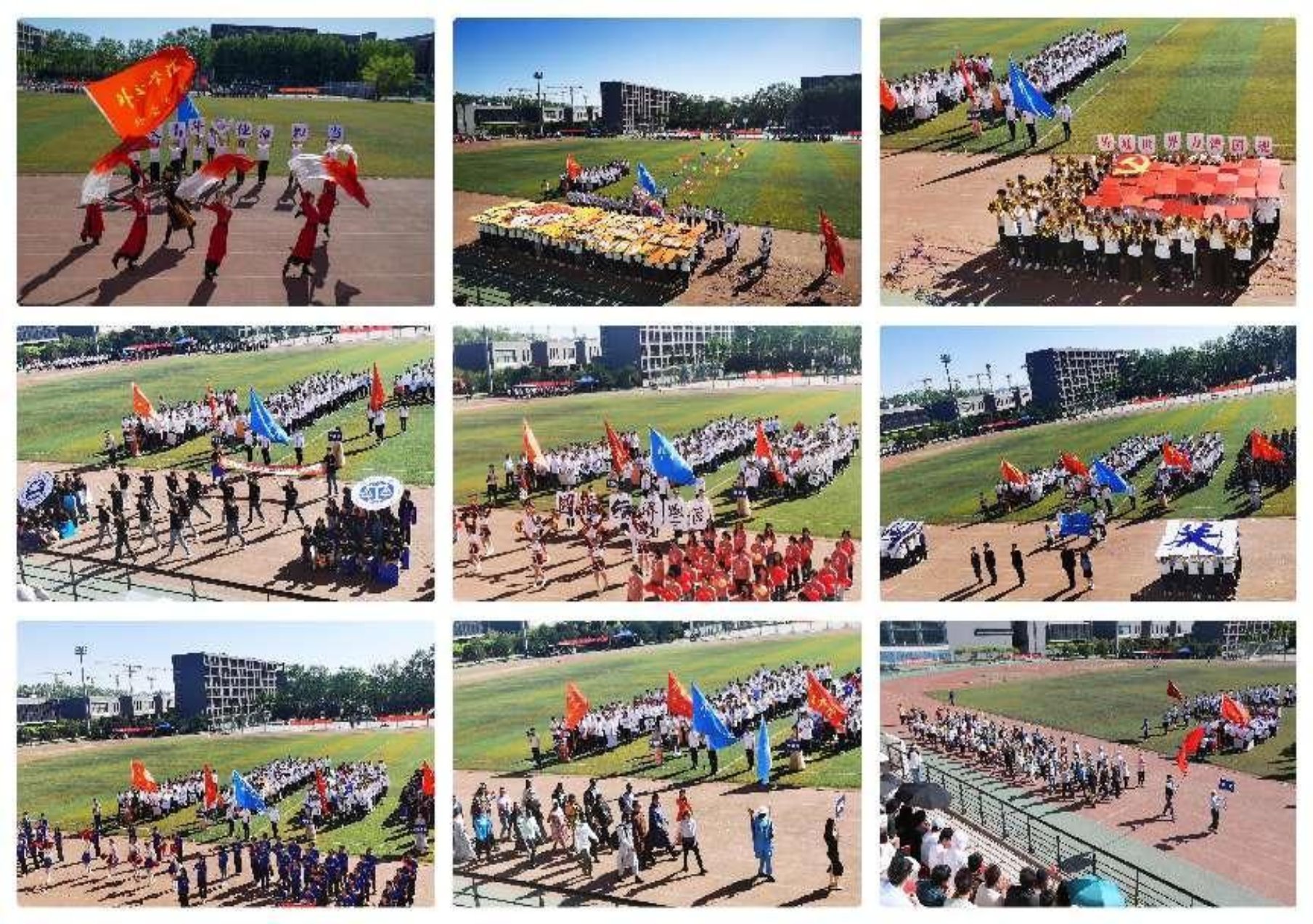 随着国旗方队、校旗方队的入场,各系部依次进场。在途径主席台时,各系部进行了各具特色的文艺展示。同学们精彩的表演迅速点燃现场气氛,运动场瞬时成了欢乐的海洋。