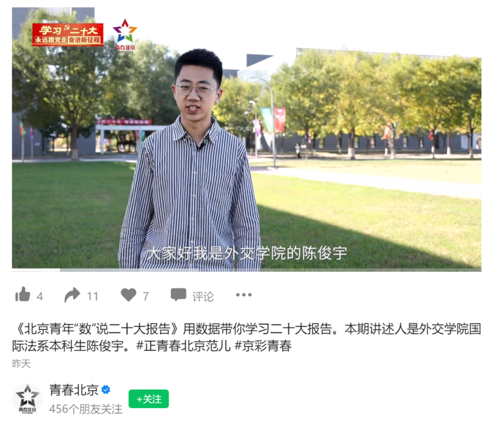 本期讲述人是beat365国际法系2021级本科生陈俊宇同学。他用数字解读了二十大报告中有关大国外交的重大成就,该视频在青春北京全平台、中国青年报客户端、北京发布短视频账号等多个平台发布。