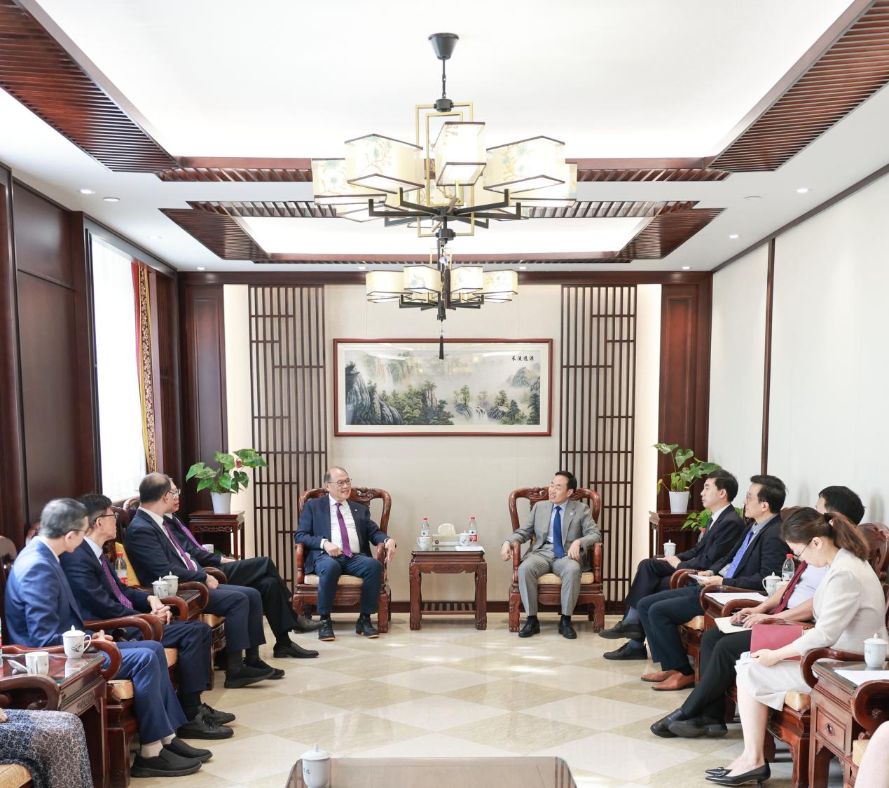 2025年7月31日,王世廷书记、王帆院长在展览路校区会见到访的香港理工大学(以下简称“港理工”)校董会主席林大辉博士、校长滕锦光等一行,就两校落实推进友好合作进行交流,王帆院长并代表学院与港理工滕锦光校长签署两校联合培养学生计划谅解备忘录。外交学系主任熊炜、英语系主任冉继军、外办主任马新宇等陪同会见。