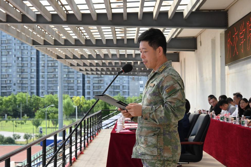 北京卫戍区某部队政治工作处主任王振虎代表承训部队讲话,对学院党委高度重视国防教育和军训工作表示高度赞扬,对圆满完成军训任务的全体学生表示诚挚祝贺。