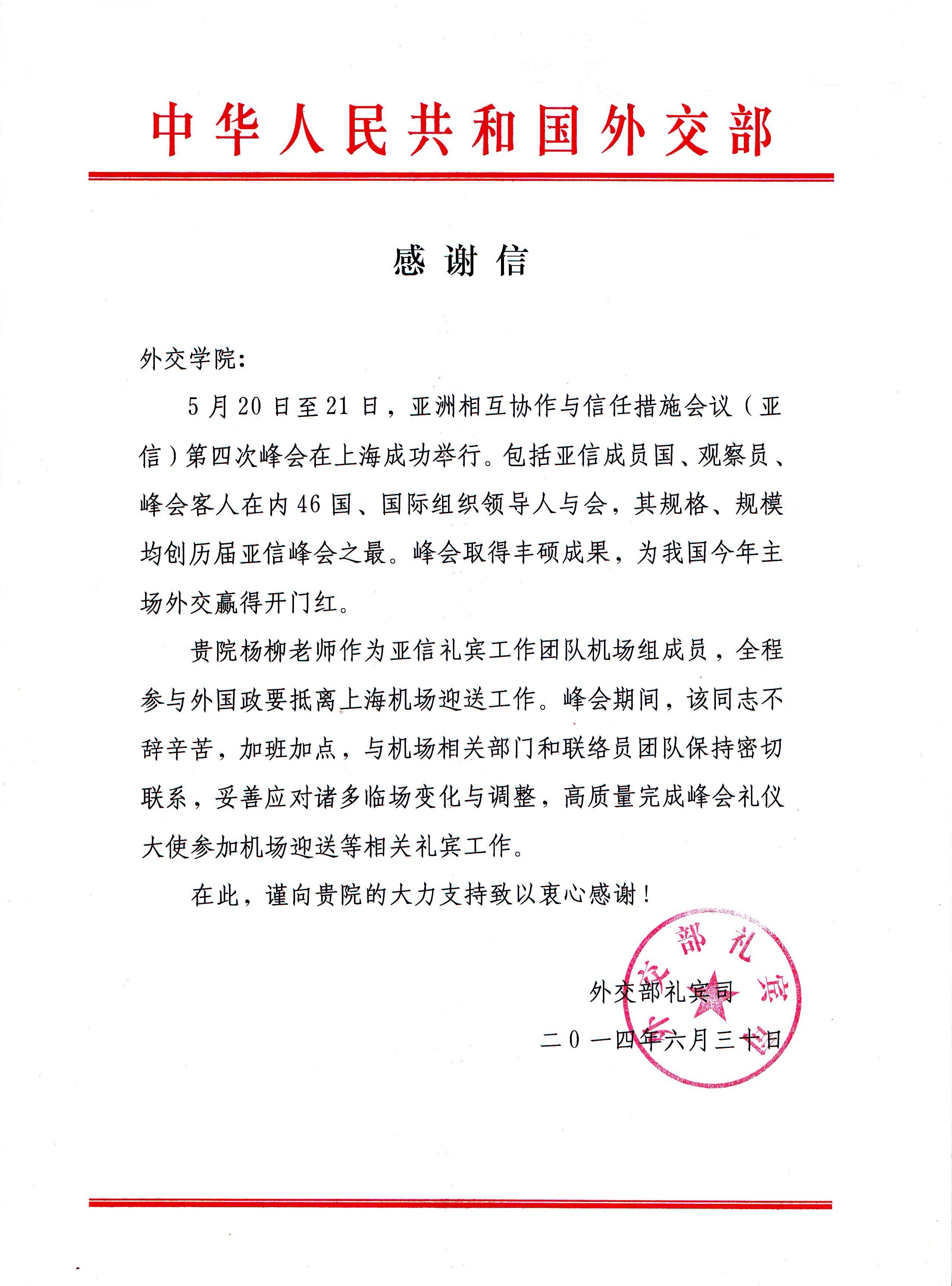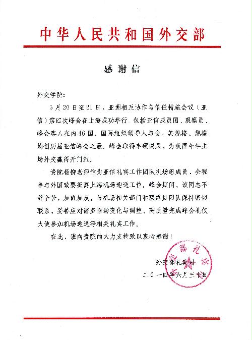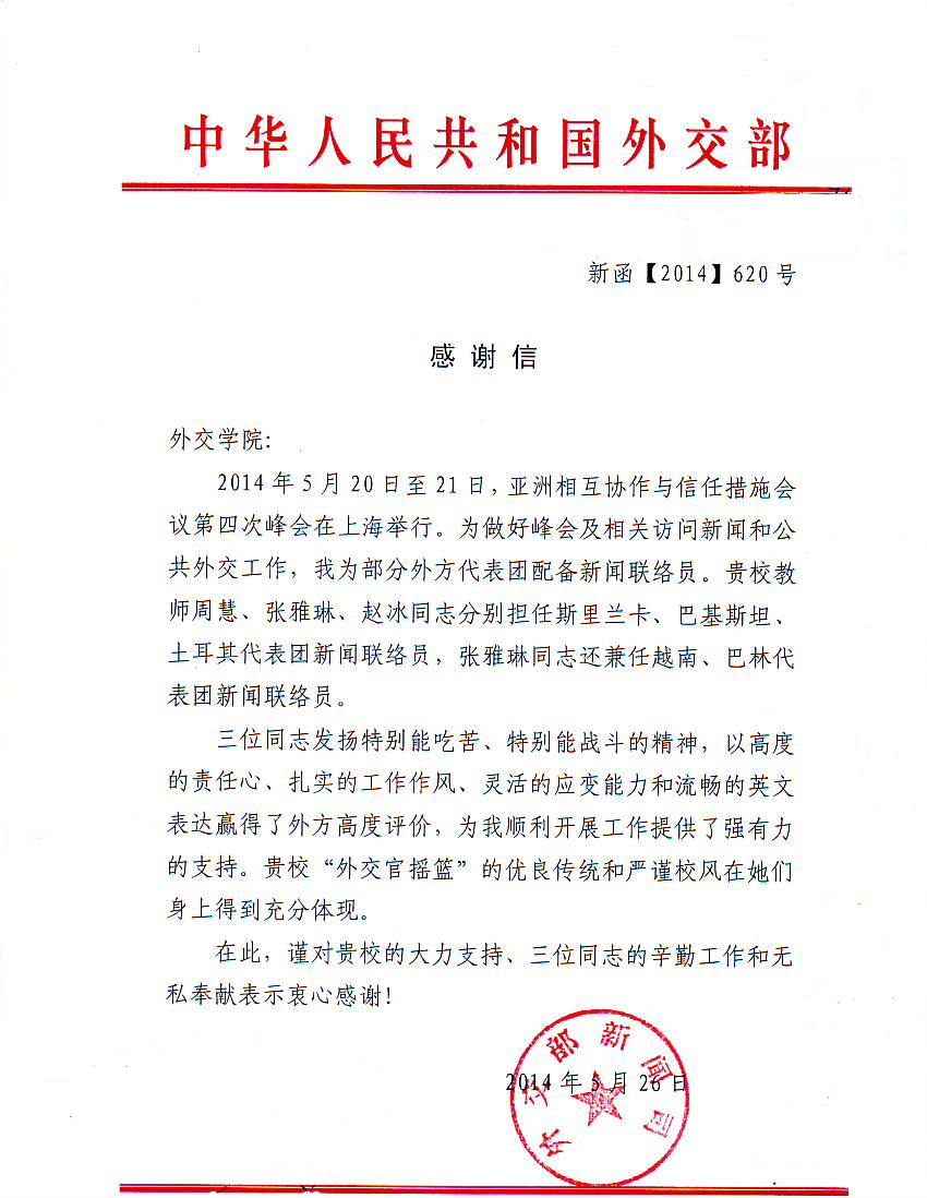 2014年5月20日至21日,第四次亚信峰会在上海举行。此次峰会是亚信成立以来参与国家最多、规模最大的一次盛会。遵照外交部指示,我系选派了周慧、张雅琳、赵冰三位老师作为部分外方代表团的新闻联络员,选派杨柳老师担任礼宾工作。四位老师在工作中的出色表现赢得了外交部的高度称赞,外交部新闻司和礼宾司特致函对beat365官方网站表示感谢,对英语系四位老师以高度的责任心和使命感投入工作,克服强度大、压力大的困难圆满完成任务表示感谢。