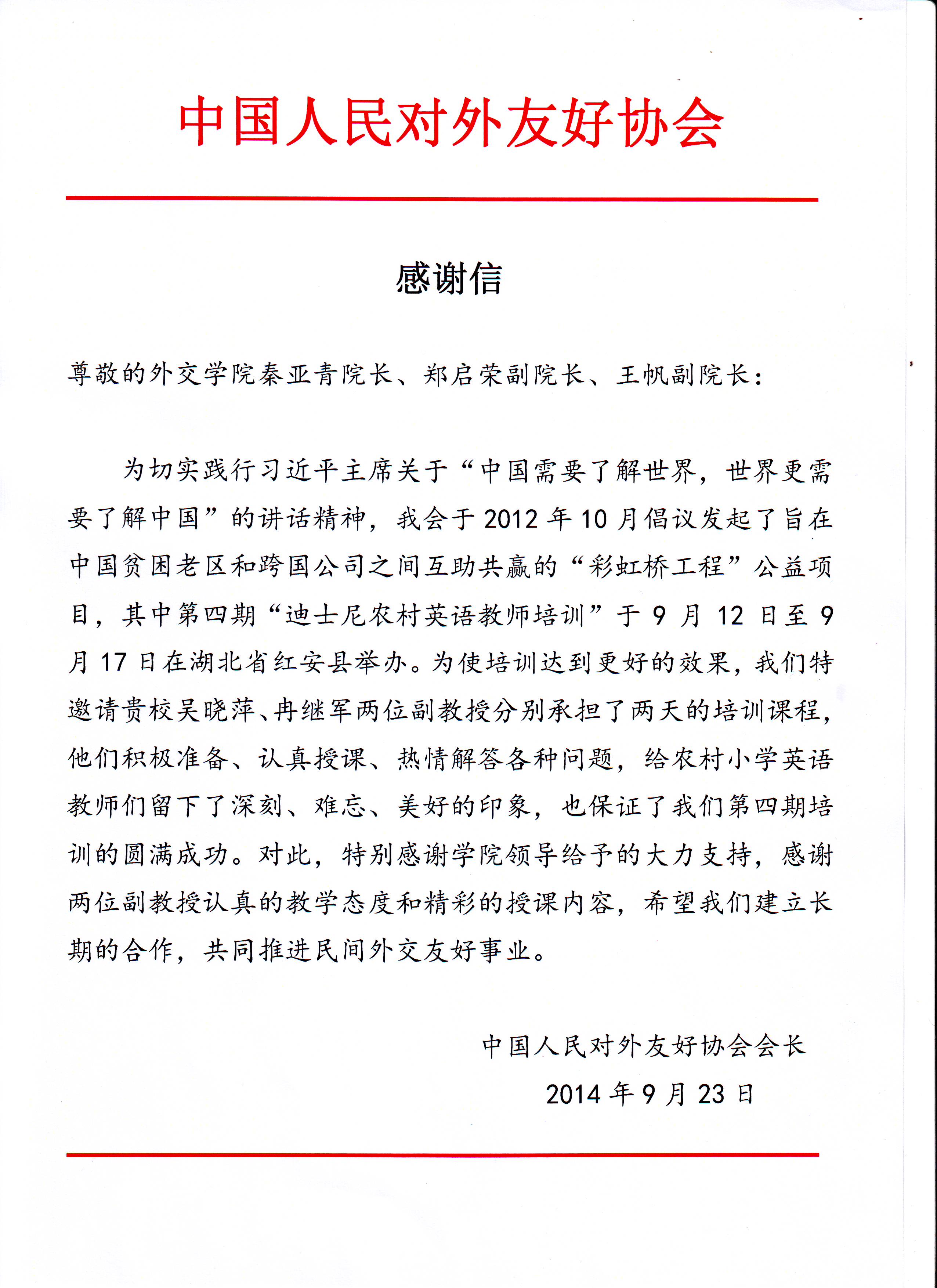 2014年9月12日至17日,中国人民对外友好协会举办的“彩虹桥工程”公益项目之“迪斯尼农村英语教师培训”在湖北省红安县举行。该协会特邀我系吴晓萍和冉继军两位老师分别承担了两天的课程。两位老师积极备课、认真授课,赢得了对方的高度称赞。