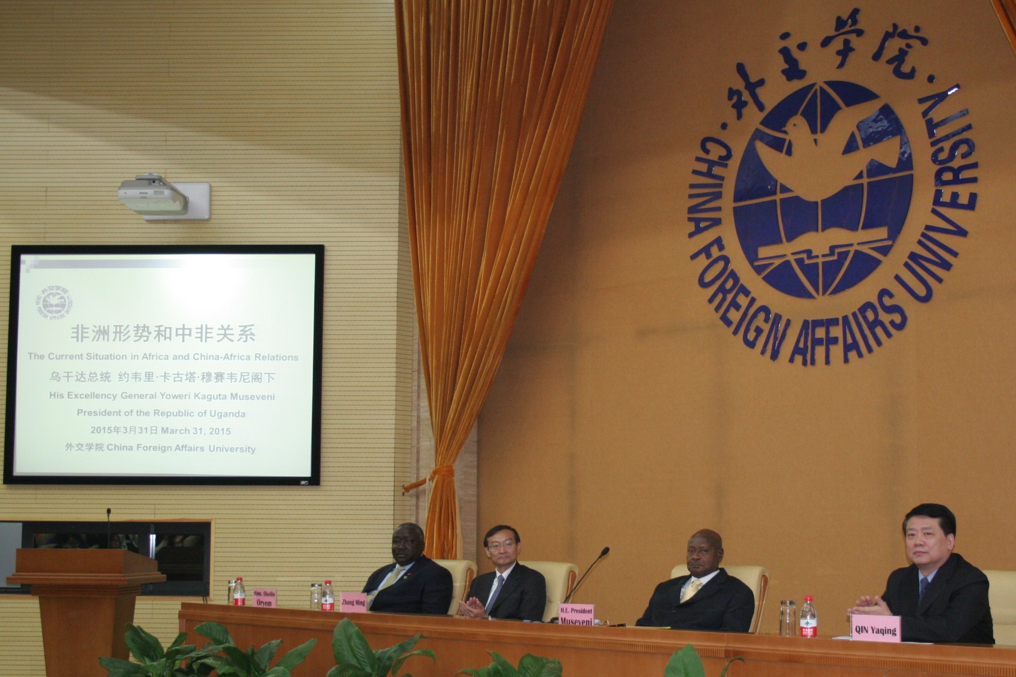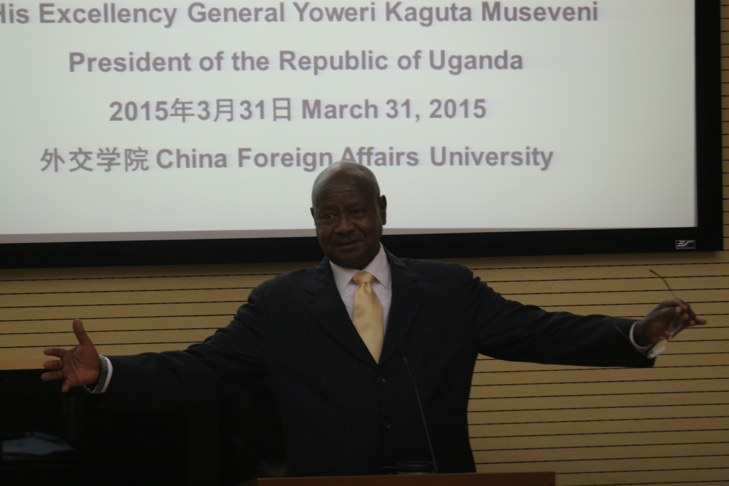 2015年3月31日上午,在中国外交部副部长张明的陪同下,乌干达共和国总统约韦里•卡塔古•穆塞韦尼率团到访beat365沙河新校区,并发表题为“非洲形势和中非关系”的演讲。