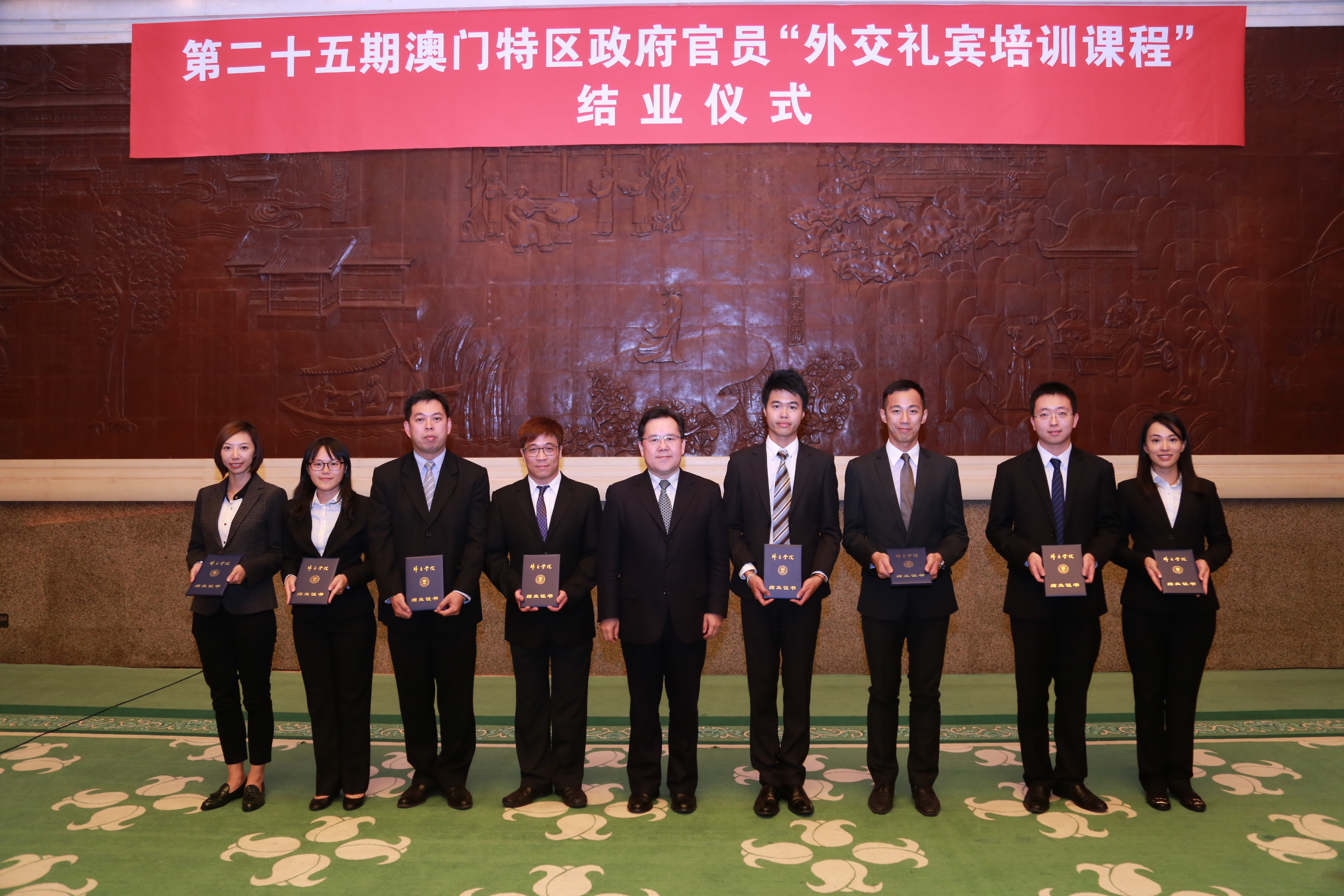 第二十五期澳门特区政府官员“外交礼宾培训课程”已顺利结业。我们将认真总结、分析该班的经验和不足,加强与澳门特区政府行政公职局和任课老师之间的协调与沟通,进一步完善对澳门公务员的培训工作。