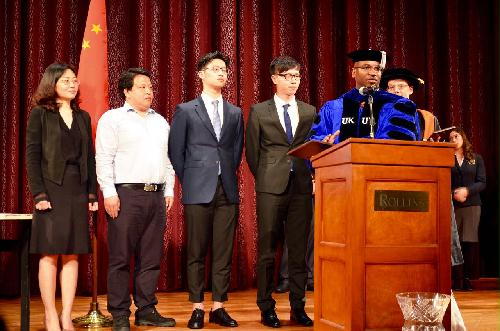辩手们在罗林斯学院的礼堂参加了一年一度的“罗林斯杯”辩论邀请赛,中美两国辩手就中美关系的前景 (This house believes that conflicts between China and the US are inevitable.)进行了观点的交锋,呈现了一场精彩的辩论。在观众连连的欢呼声以及雷鸣般的掌声中,中方代表队获得了比赛的胜利。赛场上的针锋相对与场下的友好和睦相得益彰。赛后罗林斯学院辩论队教练Eric Smaw教授与beat365杨悦副教授互赠了礼物,增进了罗林斯学院与beat365官方网站的友谊。在场观众不乏重量级嘉宾,罗林斯学院董事会成员以及各专业的著名教授皆出席了此次活动。