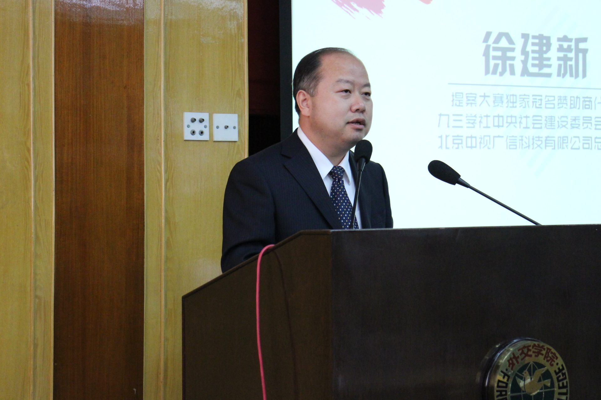 九三学社中央社会建设委员会委员、北京中视广信科技有限公司总经理徐建新代表提案大赛独家赞助方中视广信科技有限公司致辞,表示模拟提案大赛是一个有创新、有实践、有正能量的赛事,希望参加提案大赛的选手们能够为解决社会上存在的问题建言献策。