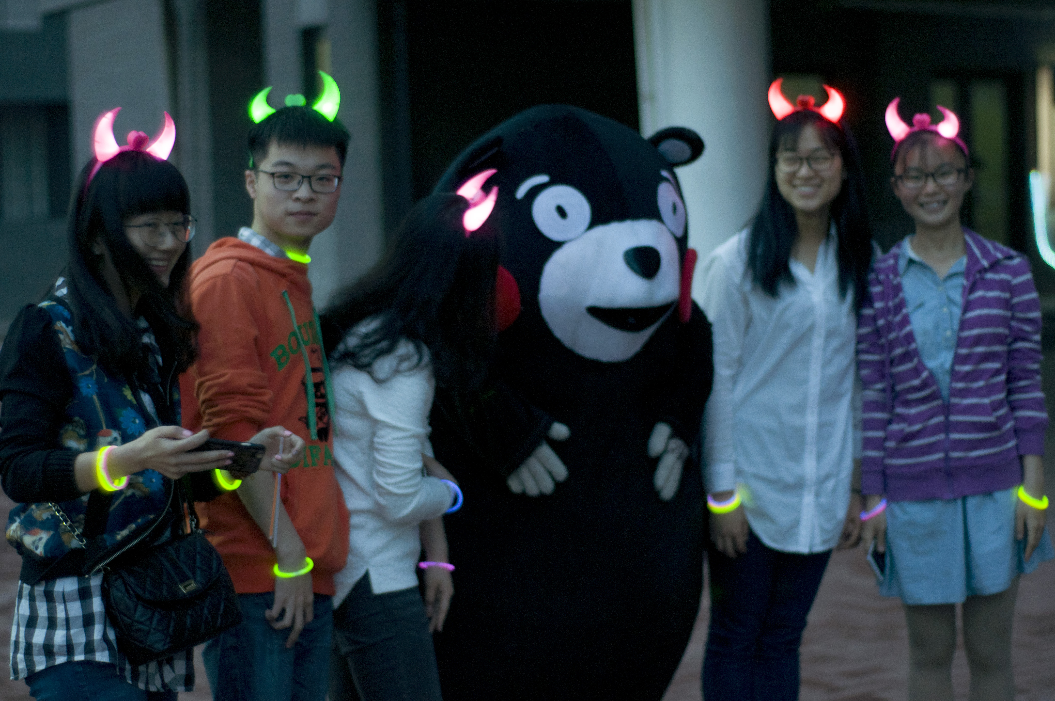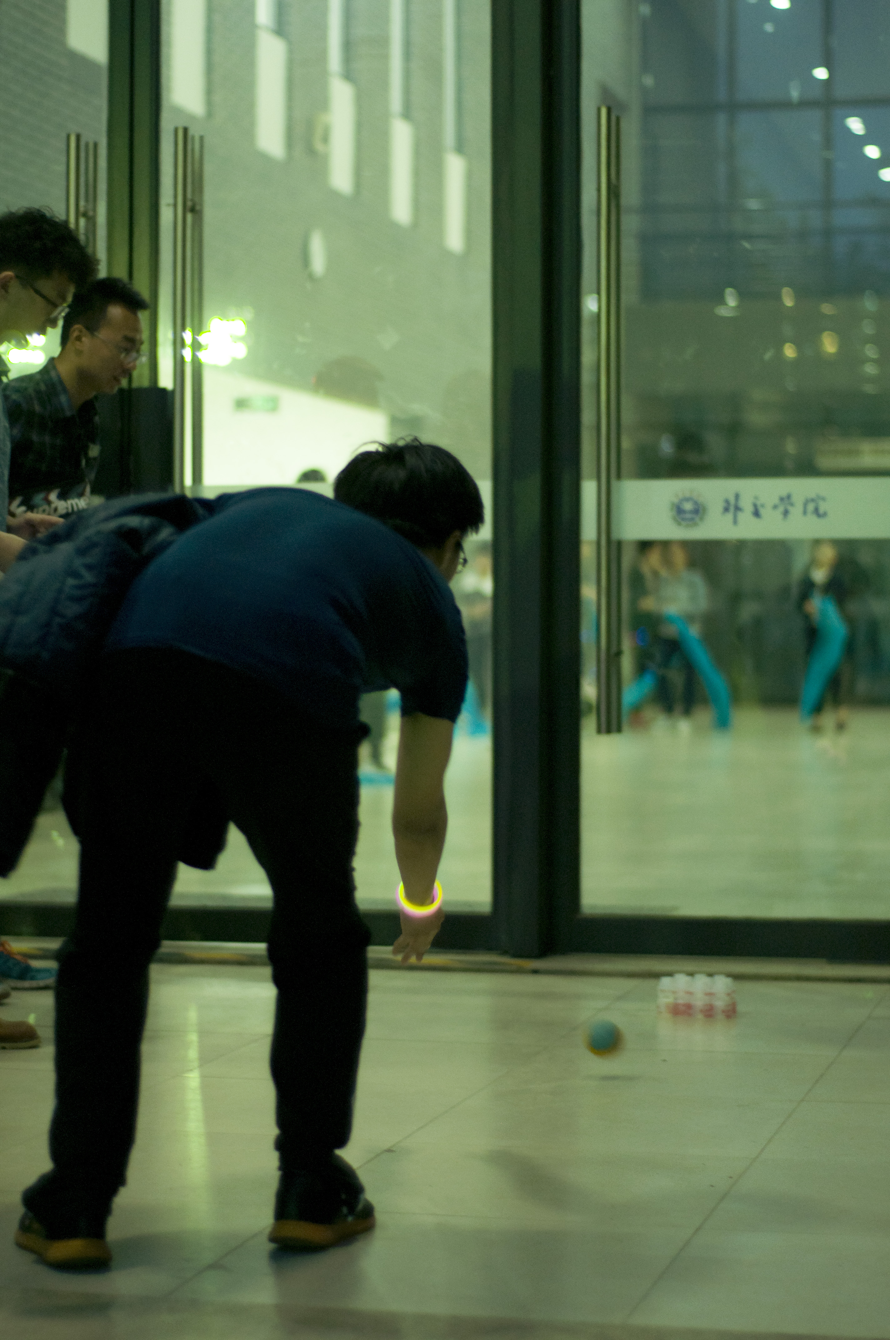 18:30,暮色初降,活动正式开始,此次荧光夜跑的任务点均设在我校各标志性建筑物附近。起点为宿舍楼下小花园,各小组找到对应的数字即可出发;接下来是铜像广场的“谁最抢镜”——随着音乐跳舞的同时,每一组成员须保证在相机拍照一瞬间均出现在照片中;然后是教学楼处的“吸纸接力”——每组需要三名选手用吸管吸起纸片成功完成运送任务;还有石桥处的“木头人障碍跑”、篮球场附近的“心有灵犀”、体育馆的“迷你保龄球”等。除固定任务外,活动中还设有三个隐藏在校园里的神秘角色,只要与其合影便可获得三分钟减时,完成所有既定任务所用时间最短的小组获胜。