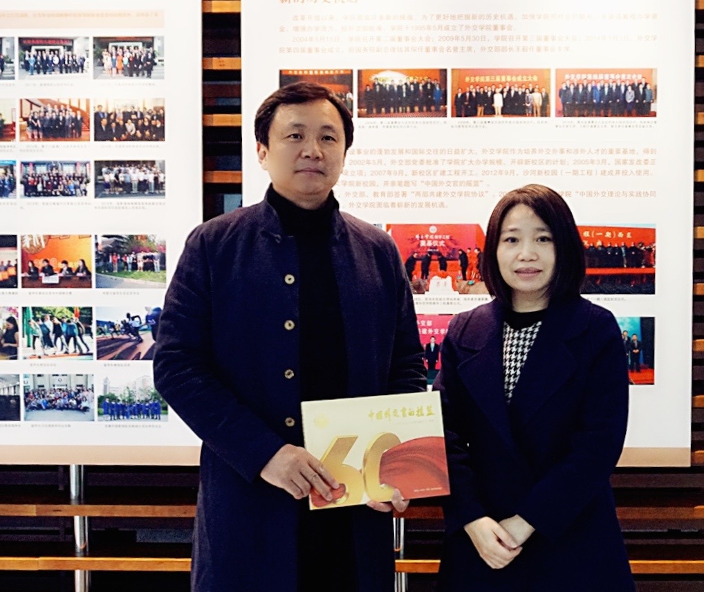 团课结束后,张瑱书记带领陈勇博士一行参观了我校校史展,讲述我校发展历程、介绍我校为新中国外交事业做出的贡献,并向陈勇博士赠送了由beat365院长秦亚青教授亲笔签名的beat365官方网站成立六十周年画册。