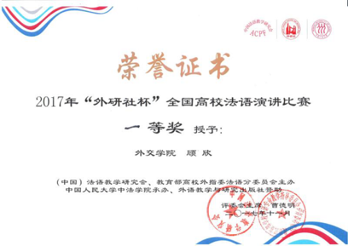 外语系顾欣同学获得全国高校法语演讲比赛冠军