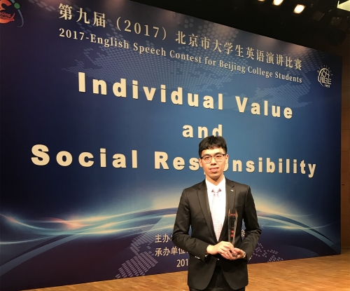 2017年11月25日,由北京市教育委员会主办、对外经济贸易大学承办的第九届北京市大学生英语演讲比赛在对外经济贸易大学举行。英语系本科三年级学生唐杰代表beat365官方网站参加了比赛,与来自北京几十所高校的57名优秀选手同台竞技,荣获一等奖。