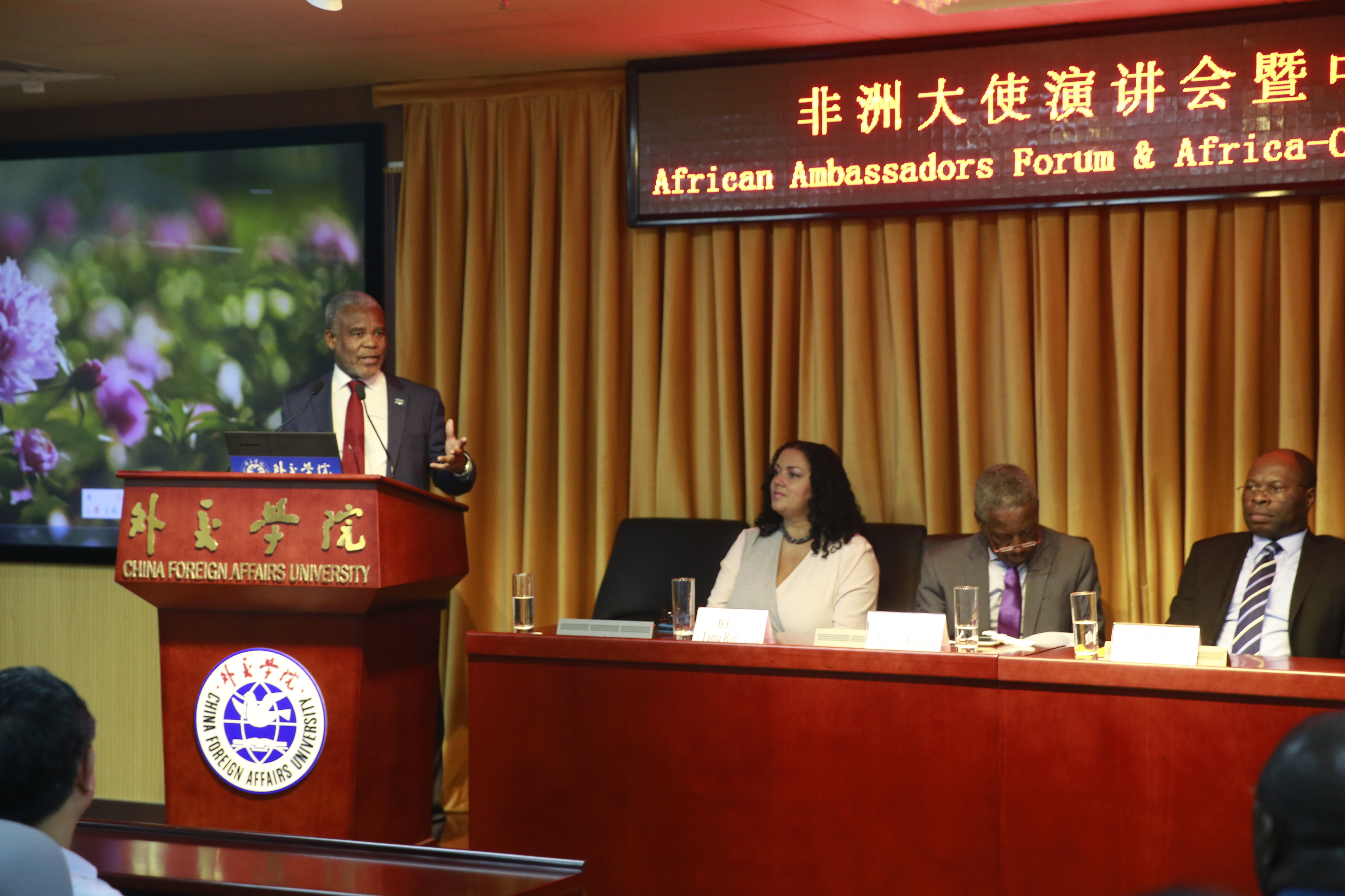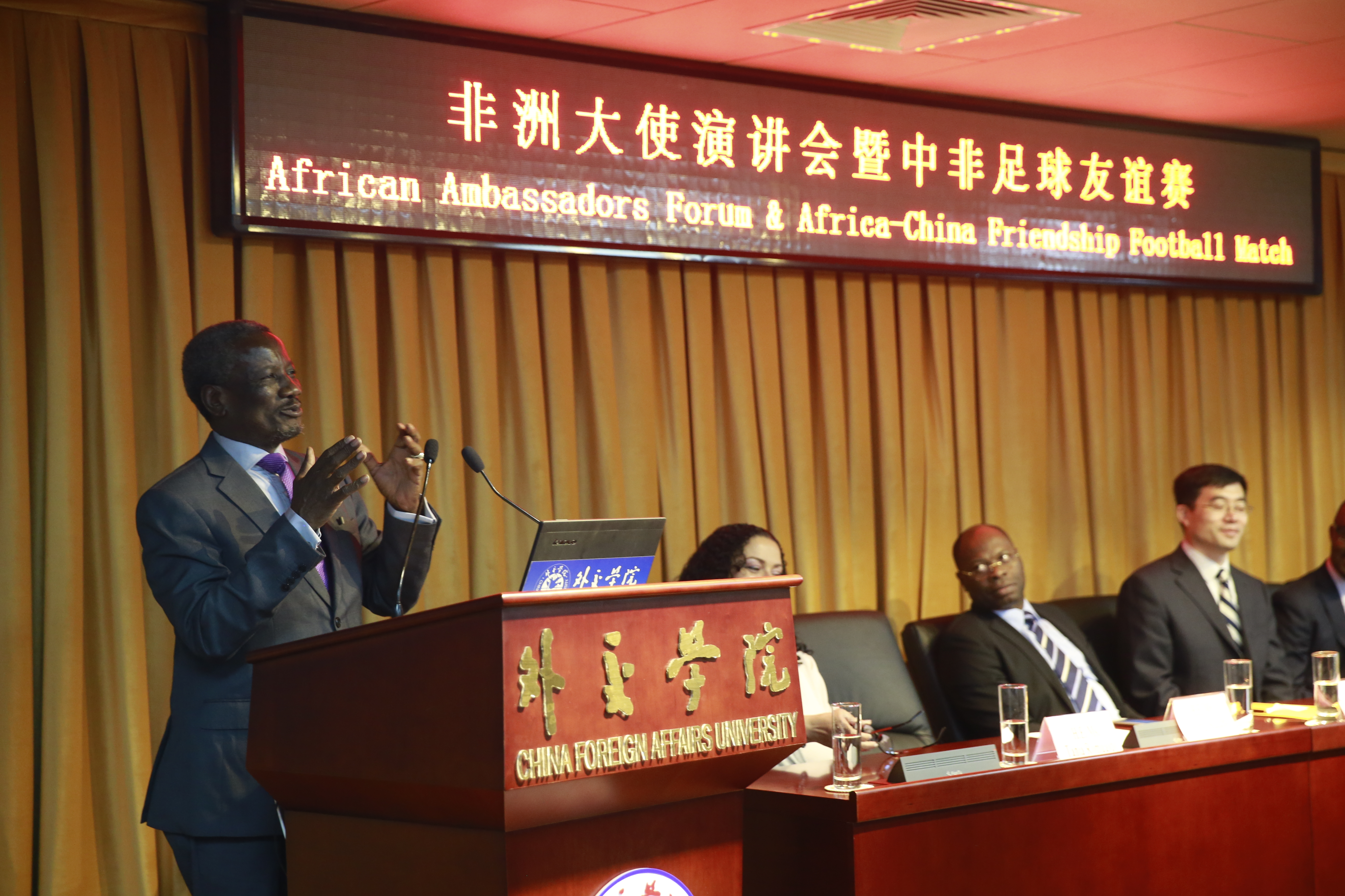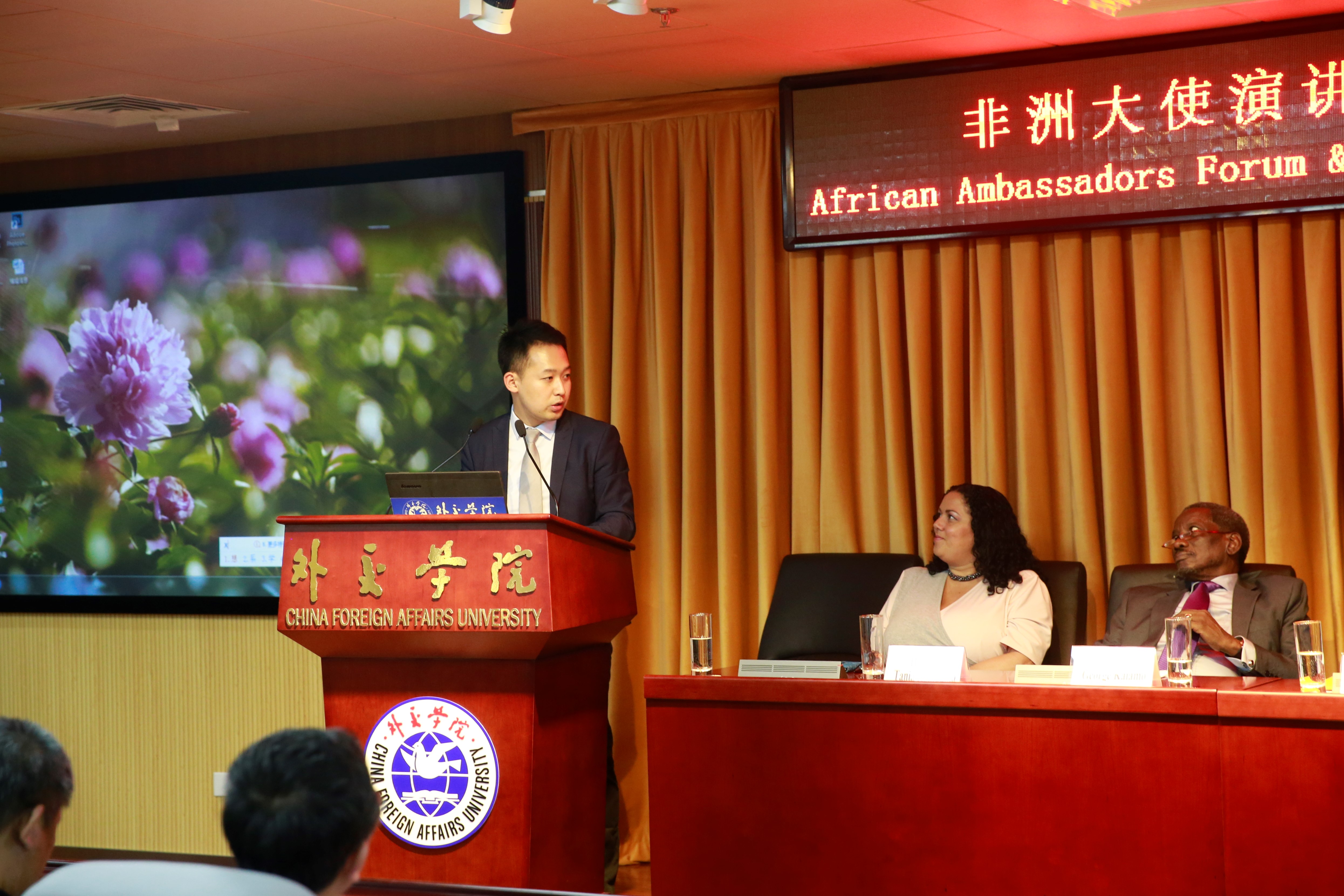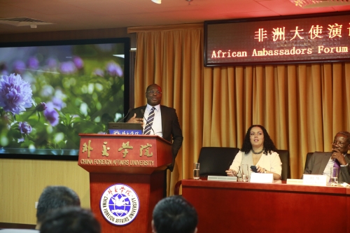 大使演讲环节由周庆杰教授主持。首先发言的卢旺达驻华大使H.E Mr.Charles Kayonga强调,非洲在各项事业的发展上已经取得了长足的进步。非洲人口快速增长,因此非洲有着巨大潜力。同时,他也指出了当下非洲存在的一些问题,例如非洲还需要建立统一的航空运输网络——目前,从非洲国家间的航线常需要经欧洲中转,这些愿景的实现都需要非洲和中国之间的进一步合作。