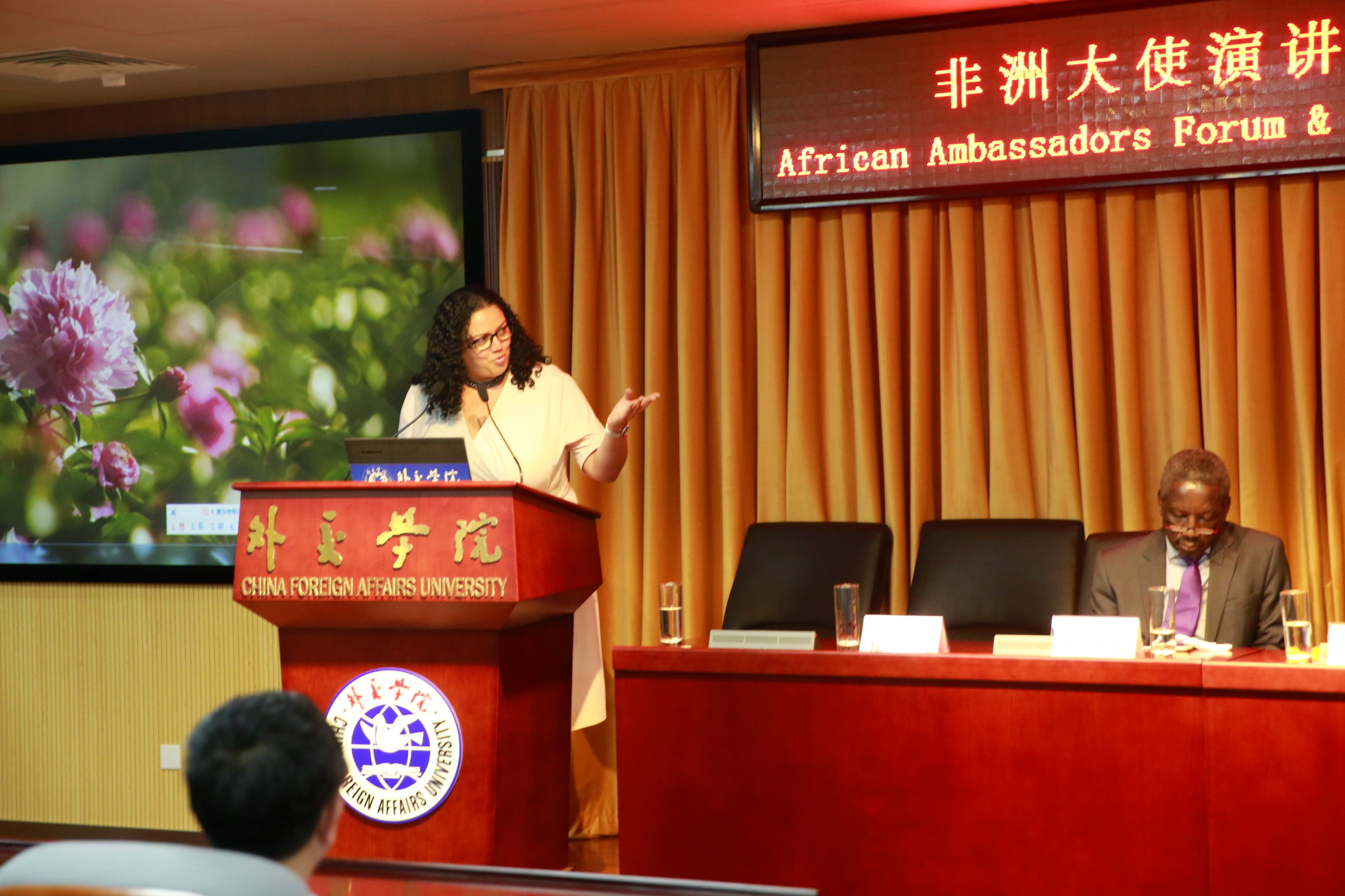 佛得角大使H.E Ms.MRomualdo告诉同学们,在习近平与祖马共同主持的中非合作论坛约翰内斯堡峰会上,双方制定了《约翰内斯堡》行动计划,同时,她还表达了对中非合作论坛能够巩固和发展非中友谊、维护世界的和平的美好期望。