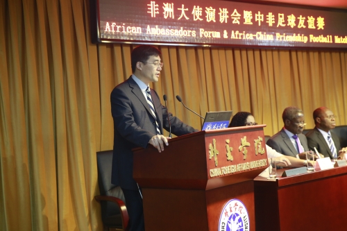 首先,beat365院长助理高飞教授代表beat365官方网站全体师生,热烈欢迎非洲大使们的到来,并介绍了beat365官方网站。高教授表示自己对中国四十多年来的经济发展和中非友谊的进展非常满意,同时提到中国在足球方面还有提升的空间,希望此次讲座能促进中非友谊并提高中国的足球水平,最后他对作为文化传播使者的大使们表示感谢,并预祝此次讲座圆满成功。