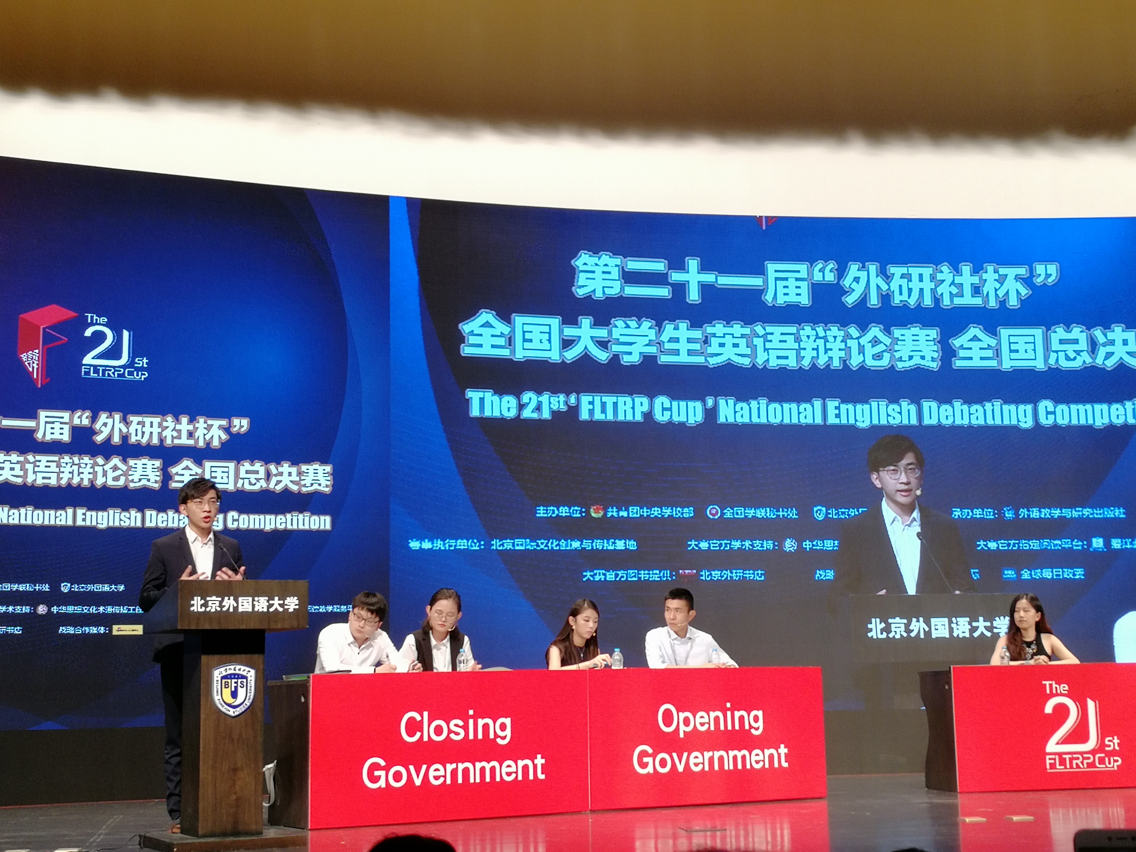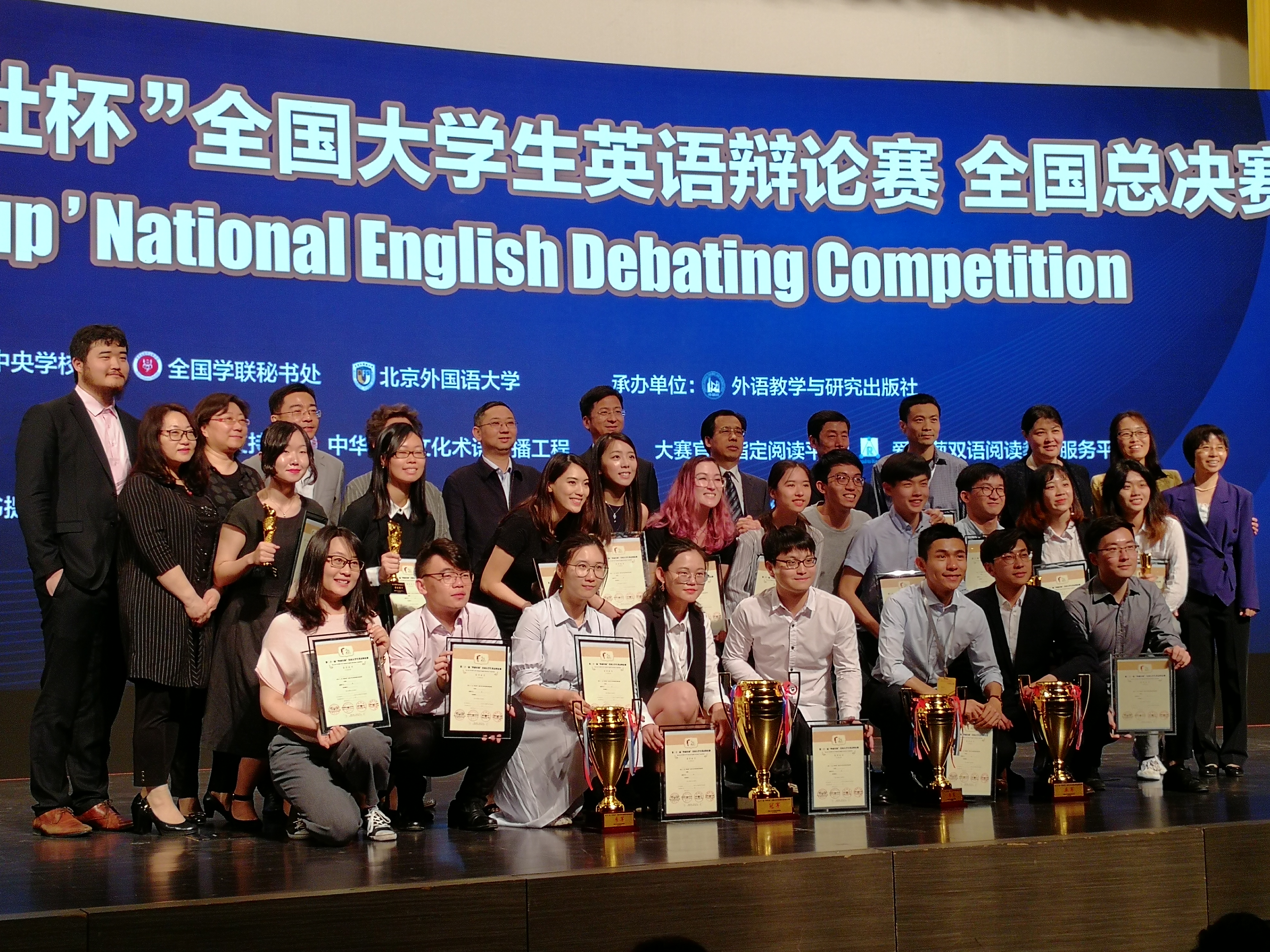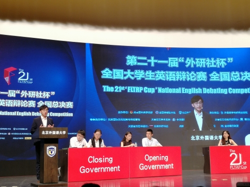 “外研社杯”全国大学生英语辩论赛由共青团中央学校部、全国学联秘书处、北京外国语大学主办,外语教学与研究出版社承办。该项赛事创办于1997年,已连续举办21届,是国内级别最高、参与最广、竞争最大的辩论比赛。本届比赛从2017年10月开始,历经校园选拔赛和地区赛,最终109支队伍晋级全国总决赛,群雄逐鹿、巅峰对决。