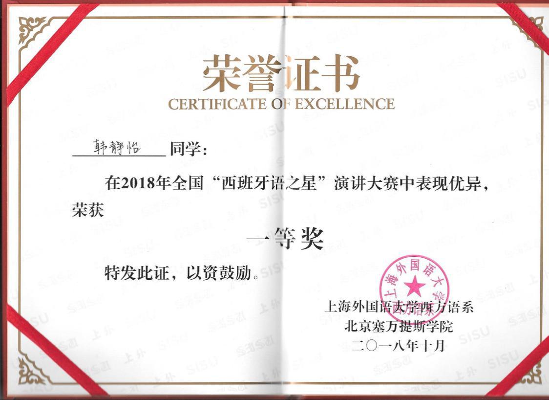 由上海外国语大学西方语系主办,北京塞万提斯学院协办,以全国开设西班牙语专业的高校本科学生为参赛对象的全国“西班牙语之星”演讲大赛决赛,于2018年10月20日在上海外国语大学(松江校区)举行。共有来自全国57所院校的382名选手报名参赛。低年级组12名选手、高年级组13名选手在经历初赛的激烈角逐后脱颖而出,进入本届大赛决赛。beat365外语系西班牙语专业大二2017313班的韩静怡同学在决赛中荣获一等奖。