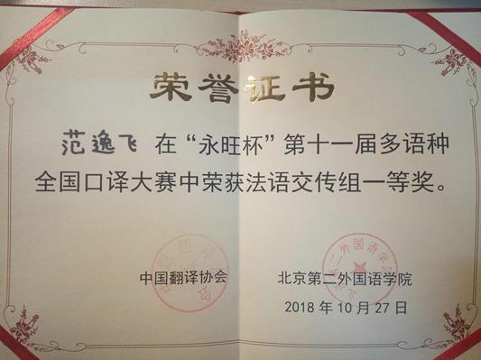 10月27日,外语系法语专业学生范逸飞在“永旺杯”第十一届多语种全国口译大赛中获得法语交传组冠军(第1名)。