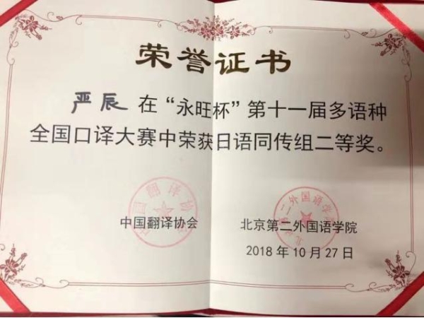 此项赛事由中国翻译协会、北京第二外国语学院共同主办,从2008年起迄今已举办11届,是国内规模最大、影响力最强的多语种口译赛事。日语比赛设同传组和交传组,每组设一等奖1个,二等奖2个,三等奖3个,优秀奖9个。经过初赛、复赛和决赛三轮鏖战,严辰同学从来自国内各大高校的选手中脱颖而出,荣获同传组亚军。
