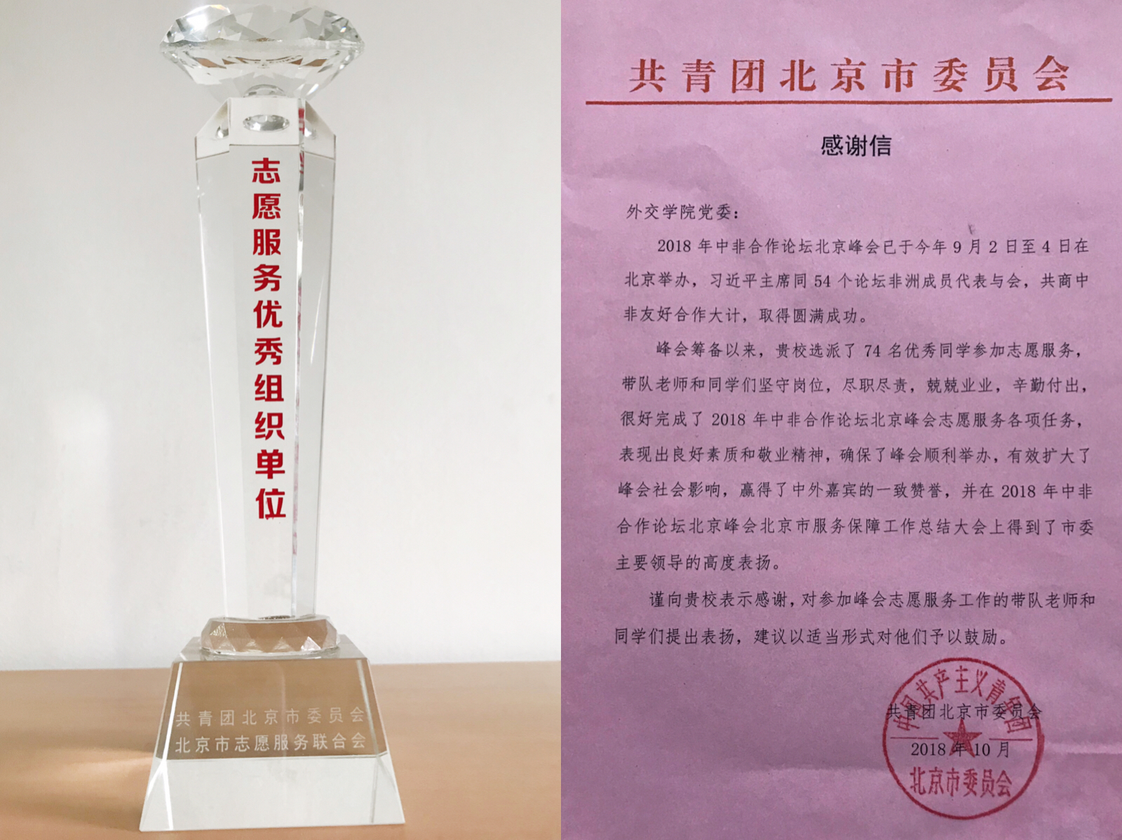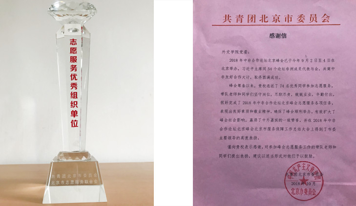 近期,2018年中非合作论坛北京峰会志愿服务工作总结表彰座谈会在京召开,我校获评“志愿服务工作优秀组织单位”,共青团北京市委员会就本次志愿服务活动向我校发来感谢信,国际经济学院刘迪一同学作为优秀志愿者代表发言。