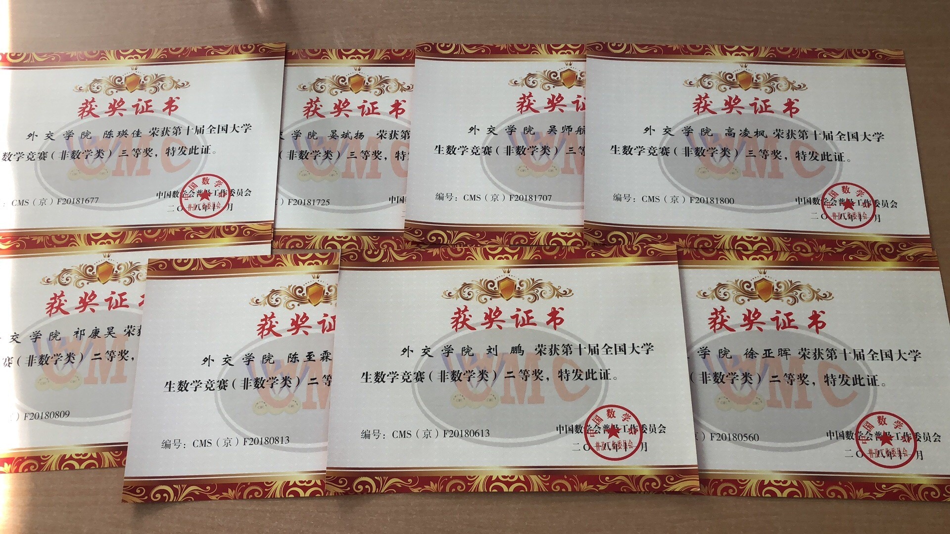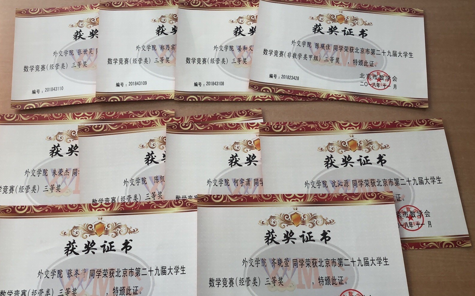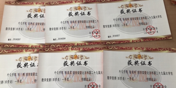 徐亚晖 、刘鹏、陈至霖等3名同学荣获北京市第二十八届大学生数学竞赛(经管类)一等奖;吴师航、晏斌扬、高凌枫等3名同学荣获二等奖(经管类),祈康昊(英语系)、陈瑛佳(外语系)等2名同学荣获二等奖(非数学类);齐晓萱、陈凯、朱荣杰、何宇潇、沈沁源、晏和义、郑乃宾、张世昊、张冬荷(英语系)等9名同学荣获三等奖(经管类)。