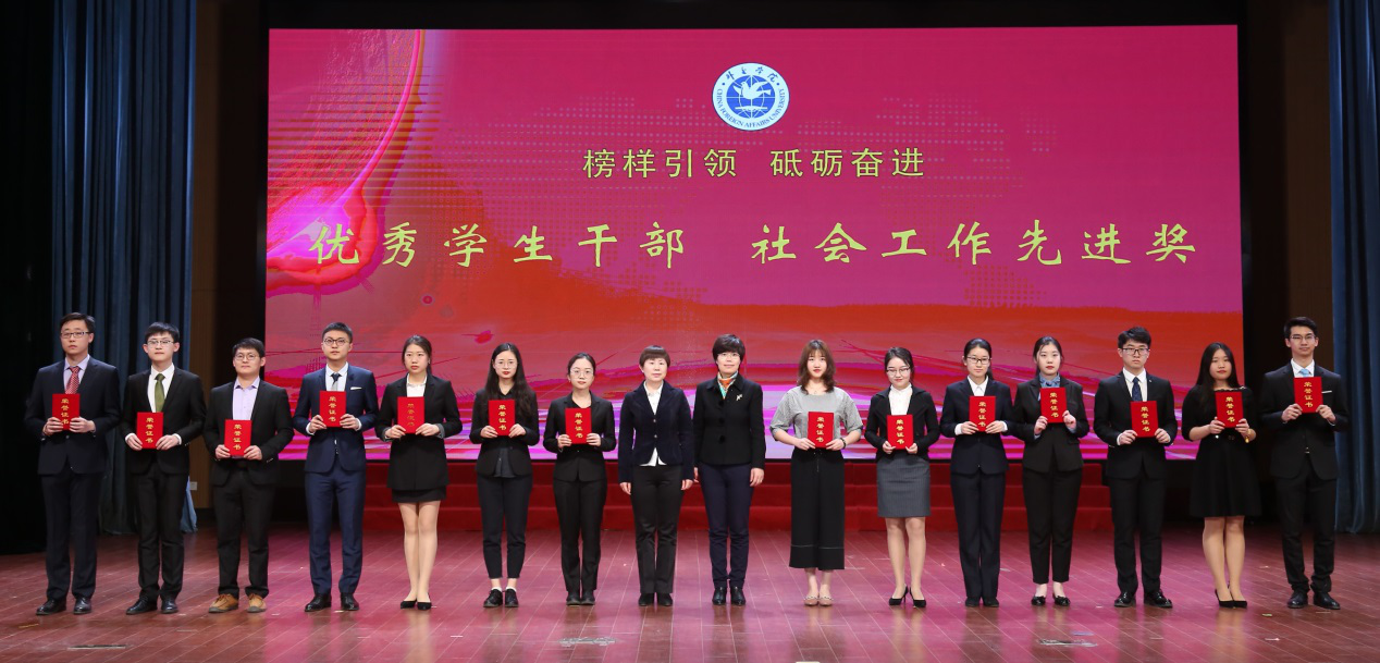 国际法系党总支书记李淑媛、国际经济学院党总支书记张静为优秀学生干部、社会工作先进奖获奖代表颁发荣誉证书