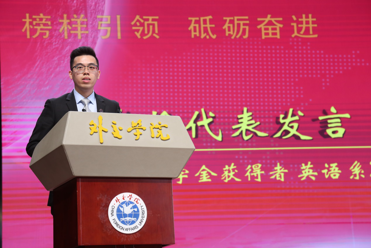 2018年度国家奖学金获得者英语系2015级唐杰同学代表获奖同学发言。唐杰同学表示,我们作为新时代的大学生要始终牢记校训,坚定理想信念,志存高远,脚踏实地,勇做时代的弄潮儿,在实现中国梦的伟大时代中放飞理想!