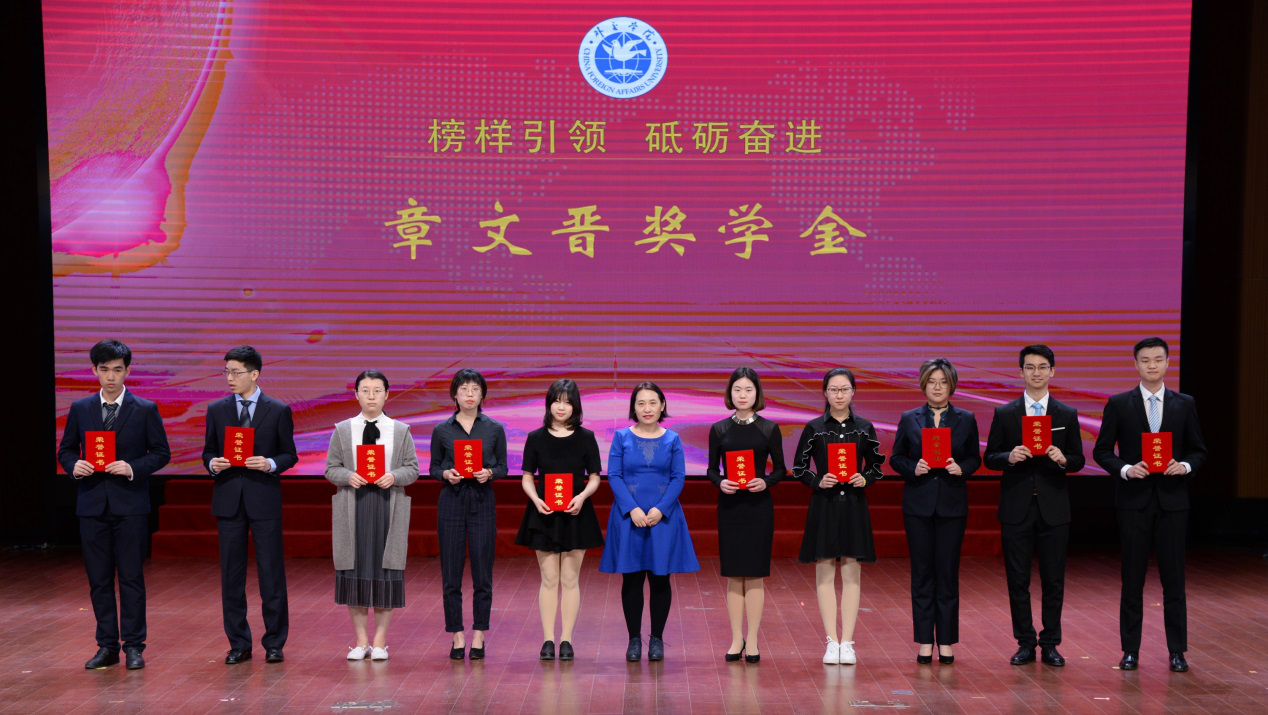 国际经济学院院长张翠珍为章文晋奖学金获奖代表颁发荣誉证书