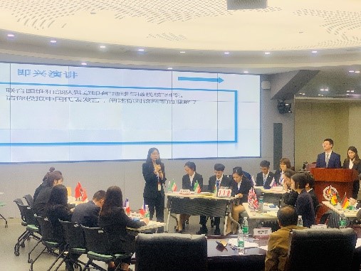 决赛共有八支队伍入围,分为多选必答题、即兴演讲和情景模拟三个环节。多选必答题要求各选手依次作答、即兴演讲要求各代表队派出一名选手根据题目即兴3分钟演讲、情景模拟要求各代表队抽签决定自己所代表的国家,并模拟在联合国大会讨论伊核问题,各国家代表需要就本国立场进行5分钟的陈述以及40分钟的自由辩论,全程要求使用英文发言。我校外院-二外联合培养队袁睿作为代表参与即兴演讲,随后全队代表德国进行了立场陈述,并与其他代表队自由辩论。