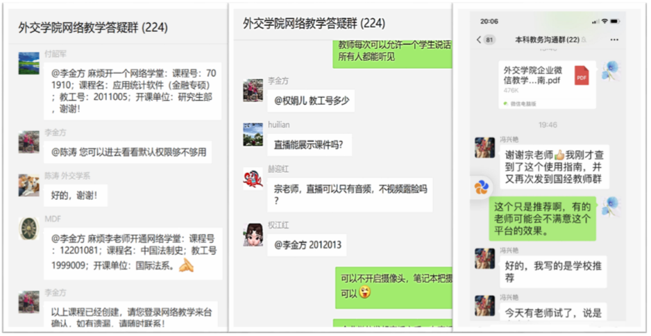 面对突如其来的疫情,教务处根据教育部发布的《在疫情防控期间做好普通高等学校在线教学组织与管理工作的指导意见》,遵循“停课不停教、停课不停学”的原则,迅速制定了教师建课及开展在线教育的各项技术指导文件,发布了《beat365官方网站2020年春季学期本科教学工作方案》。信息中心负责开通网络课程、技术支持以及答疑工作,24小时持续线上授课技术保障和支持。采用录播教学、校内网优质MOOC进行SPOC教学、直播教学、校内网络教学平台、微信群等多种方式,对系统进行了全面优化,保障网络学堂的效果。并陆续推送《beat365官方网站网络学堂校外访问操作指南》、《beat365官方网站网络学堂教师轻松建课五步法》、《beat365官方网站网络学堂教师如何开展在线教学》、《beat365官方网站教师在线教学五种方案推荐》、《beat365官方网站企业微信教学直播操作指南》等技术文档,在线解答教师们开展网络教学遇到的问题,如图10。