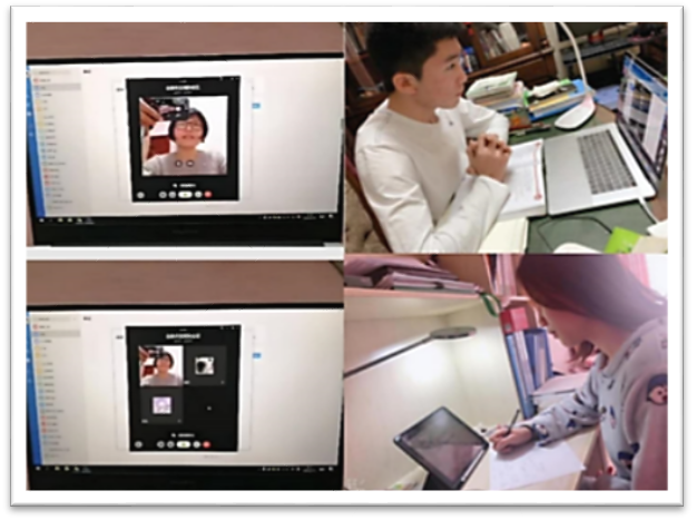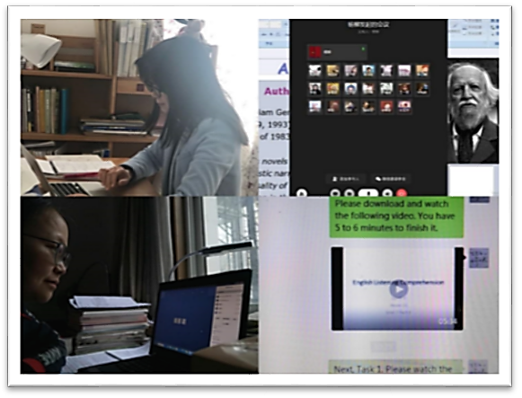 英语系教师结合授课程特点、学生需求、网络硬件及软件条件等因素,采取了企业微信会议模式直播课程,利用微信群语音讲座/答疑+微视频,利用网络学堂录播课/课程资源+微信群讨论/答疑等三种形式开展线上教学。图3为英语系梅琼老师和张蕾老师视频直播,杨柳老师企业微信授课,许宏晨老师微信群授课。