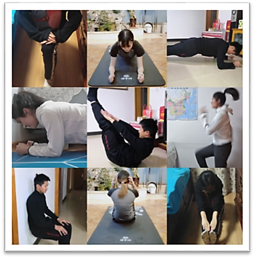 基础部将慕课和网络学堂相结合,开通直播平台,并增设学生线上学习小组,提升学习效果。对外汉语课程,针对留学生不同国家的时差问题,任课教师课前跟每一位学生就教学时间和方式进行逐一沟通,以确保教学工作的顺利开展。体教的教师们通过微信群等形式解答学生的咨询问题,帮助学生制定居家锻炼计划,帮助学生进一步认识到疫情期间适当运动是身体健康的重要保证。图7为思政课教师崔朝东与学生一起进行慕课学习。图8为学生在教师指导下居家锻炼。