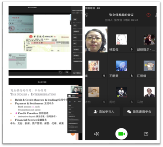 国际经济学院通过微信群组织教师讨论了专业理论类课程、数量统计类课程、专业实践类课程在线教学方式方法,在做好在线课程建设和提升的同时,大力推动混合式课堂和特色课程建设。图6为国际经济学院杨光老师的《财务会计》 欧明刚老师的《商业银行管理》企业微信直播,张文佳老师的《财务管理》会议教学。