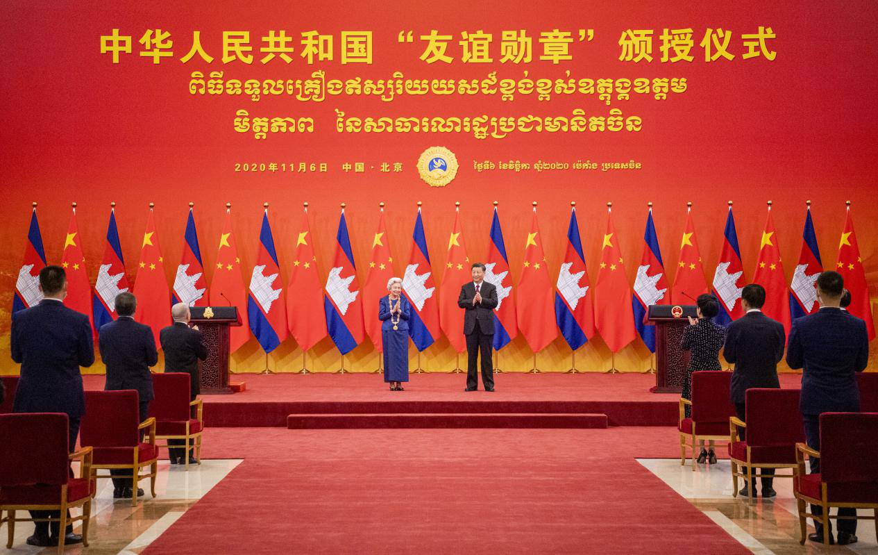 11月6日,中国国家主席习近平在人民大会堂为柬埔寨太后莫尼列举行中华人民共和国“友谊勋章”颁授仪式。习近平表示,中方愿同柬方一道,传承和发扬由中国老一辈领导人和西哈努克太皇、莫尼列太后共同缔结的中柬传统友好,让中柬关系在新的历史时期焕发新的生机活力,为两国人民创造更多福祉。