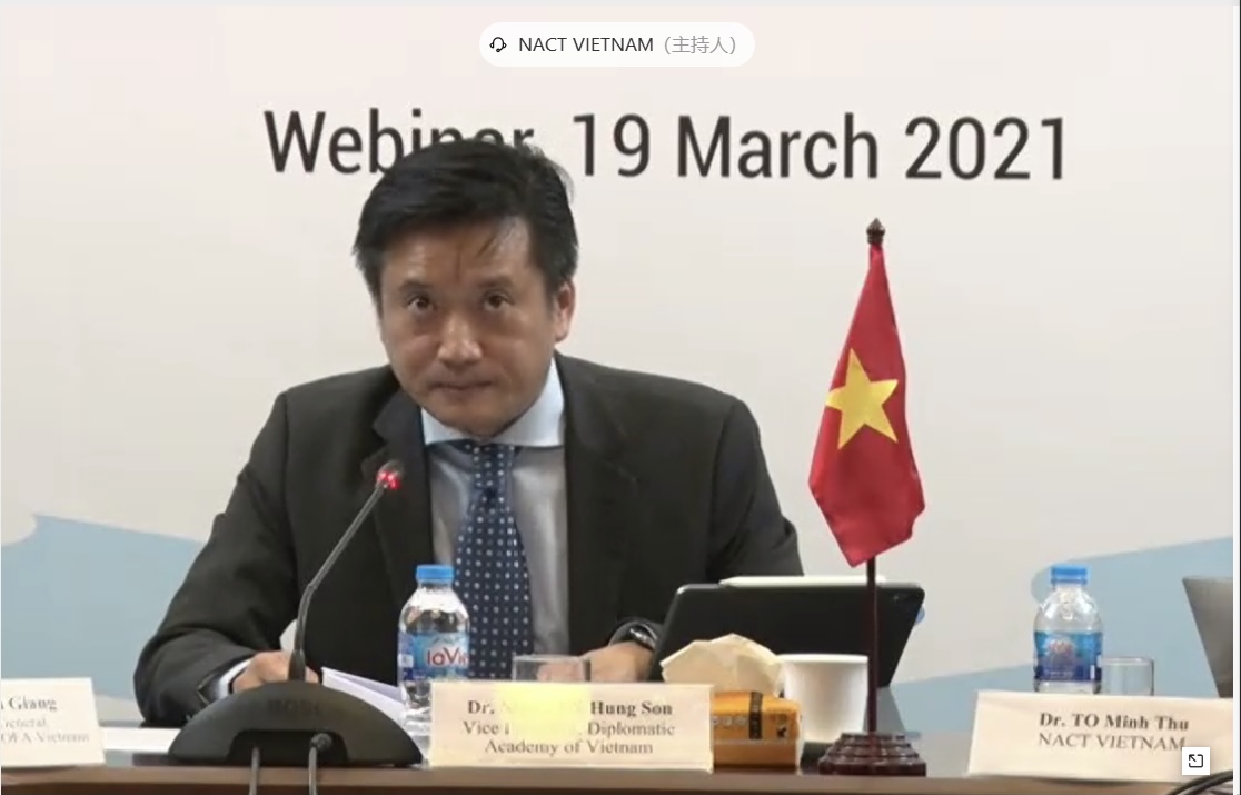 2021年3月19日,中国—东盟思想库网络(NACT)第七次国家协调员会议暨中国—东盟对话关系30周年智库论坛以视频会议形式成功召开。本次会议由中国beat365官方网站和越南beat365官方网站联合主办。来自中国驻东盟使团、东盟秘书处、越南和文莱两国外交部代表以及中国和东盟各国相关领域专家约40人出席会议。中国beat365官方网站院长徐坚博士、越南beat365官方网站副院长阮鸿声博士(Nguyen Hung Son)致开幕词。中国beat365官方网站副院长高飞教授致闭幕词。
