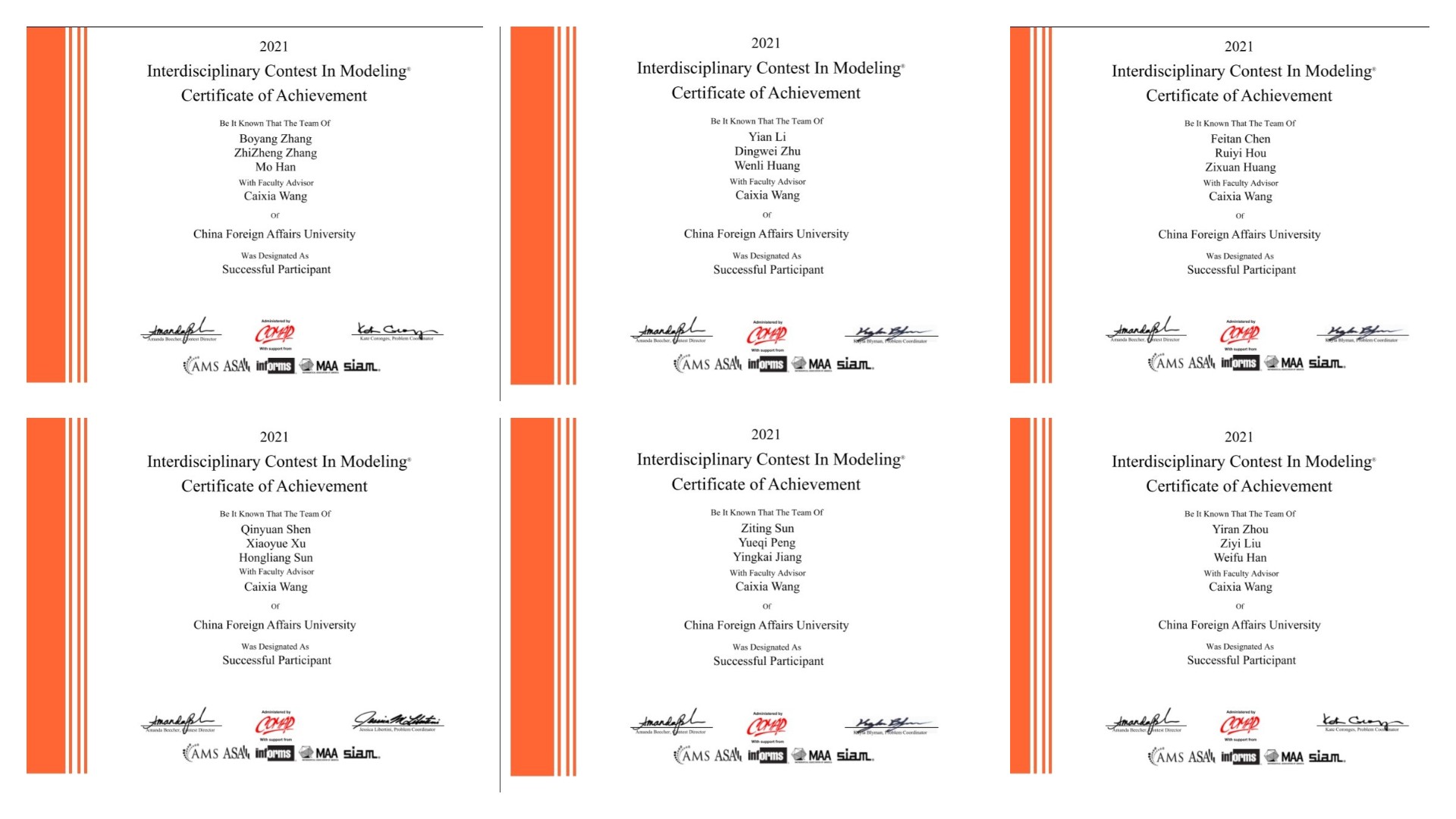 2021年美国大学生数学建模竞赛和交叉学科竞赛(MCM/ICM,简称“美赛”)在美国东部时间2021年2月4至8日(北京时间2021年2月5至9日)举行。在国际经济学院的组织下,我校27名学生组成9支队伍参加此次竞赛,最终获得国际一等奖(Meritorious Winner,简称“M奖”)1项、国际二等奖(Honorable Mention,简称“H奖”)2项,国际三等奖(Successful Participant,简称“S奖”)6项。