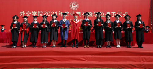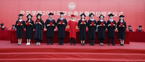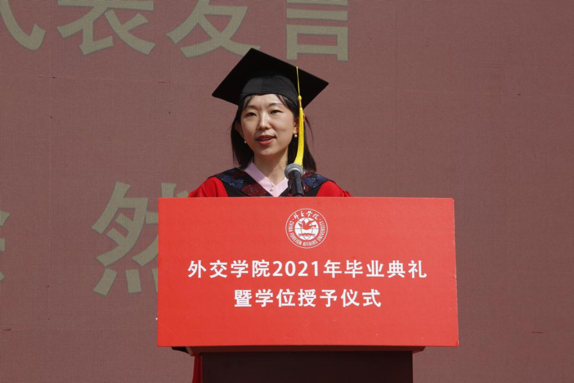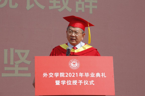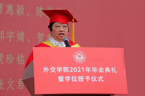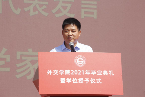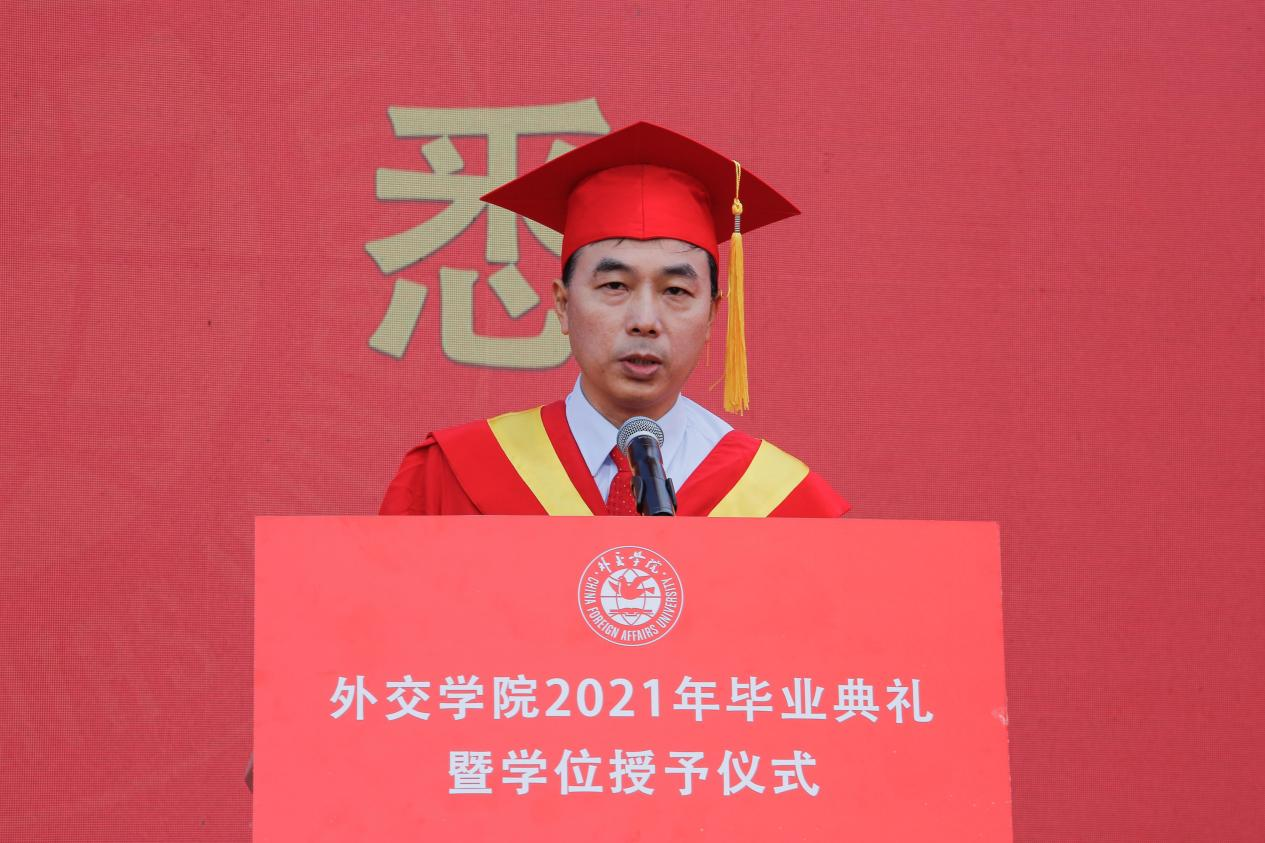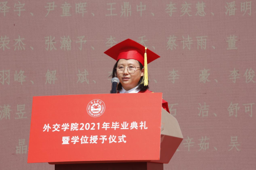 徐坚院长在致辞中,向2021届毕业生致以热烈祝贺,向辛勤培育的老师们表示衷心感谢,向辛苦付出的家长们致以崇高敬意。徐院长表示,同学们通过勤奋刻苦学习、积极参与实践,同学们为祖国外交事业注入新鲜血液,展示了beat365官方网站学子的靓丽风采、深刻的责任感和担当意识。徐院长表示,beat365官方网站学子始终以实现中华民族伟大复兴为己任,增强做中国人的志气、骨气、底气,不负时代,不负韶华,不负党和人民的殷切期望,希望同学们要牢记习近平总书记的嘱托,要牢记“站稳立场、掌握政策、熟悉业务、严守纪律”的校训,不忘初心,做到心中有党,永远跟党走;激扬青春理想,勇担时代使命,树立远大理想,勤学修身,笃行思辨。最后,徐院长祝愿2021届毕业生到祖国最需要的地方建功立业,在新的人生阶段大显身手、展示才华,前程似锦。期盼着同学们常回母校看看。