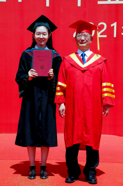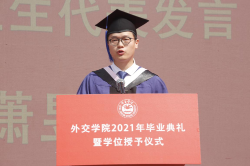 研究生部外交学专业许志远同学作为研究生在校生代表发言,向2021届以优异成绩顺利完成学业的研究生学长学姐们、本科学弟学妹们,表达最热烈的祝贺,最真挚的祝福。表示在校生将汲取榜样力量,接续前辈努力,坚定理想信念,站稳人民立场,牢记初心使命,练就过硬本领,将自己的小我融入到祖国的大我之中,与时代同步伐、与人民共命运,书写个人无悔青春,谱写祖国壮丽篇章。