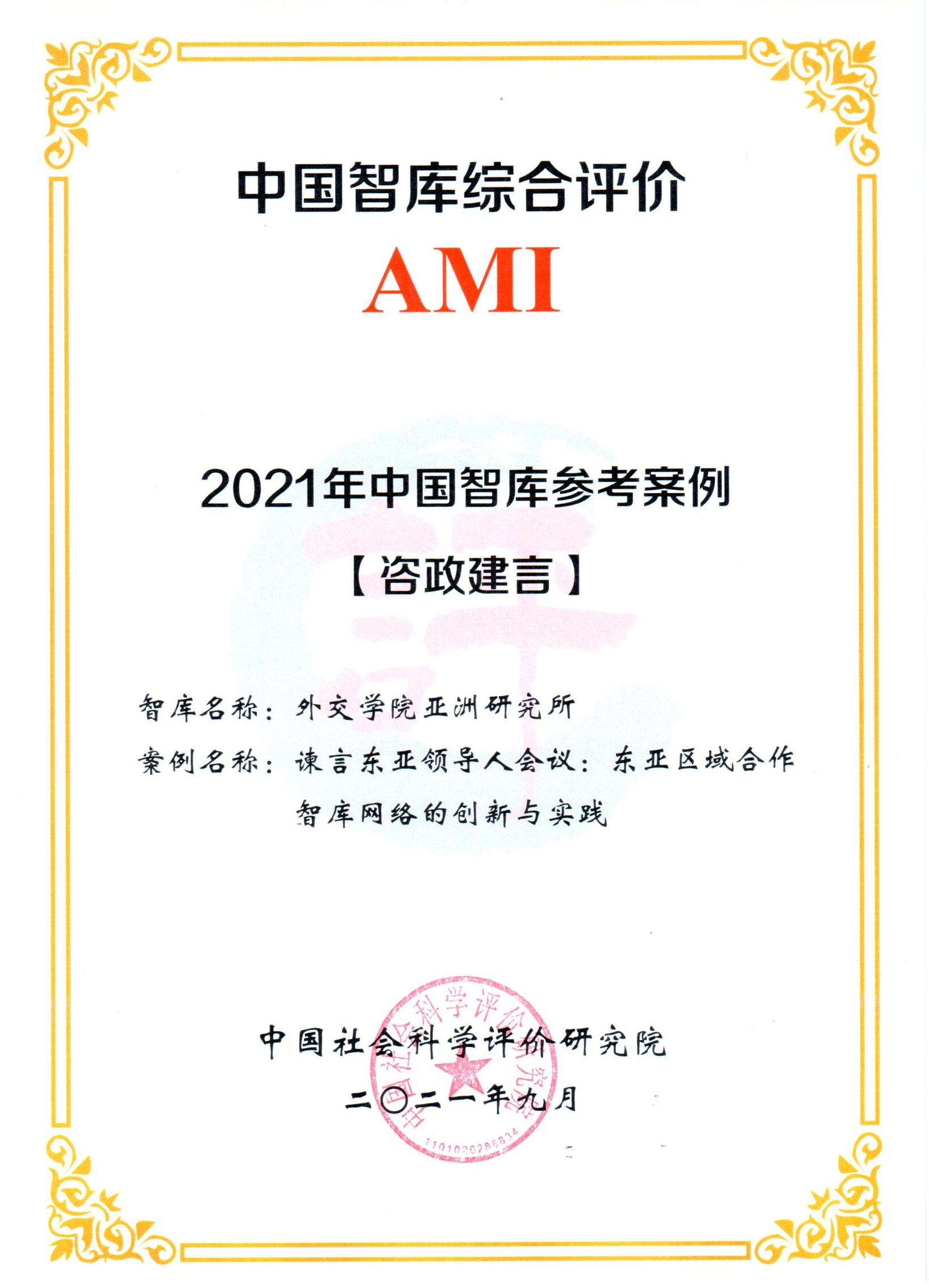 会上正式发布了《中国智库AMI综合评价研究报告(2021)》。亚洲研究所申报的“谏言东亚领导人会议:东亚区域合作智库网络的创新与实践”入选“咨政建言”类参考案例。据悉,本次入选的参考案例(63份)约占申报案例总量的10%(621份),涵盖咨政建言、理论创新、舆论引导、社会服务、公共外交和内部治理创新六大领域。
