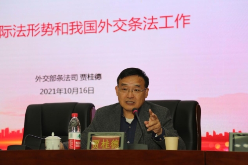 贾桂德司长首先分享了学习习近平法治思想的体会;总结了中国恢复联合国合法席位的50年中在国际法遵守和发展方面做出的重要贡献;最后结合当前国际法的热点问题,展望了全球治理中国际法的新发展。校友范琨副司长的报告总结了新中国边海工作的成就与经验,分析了边海问题与国际法的关系等问题。