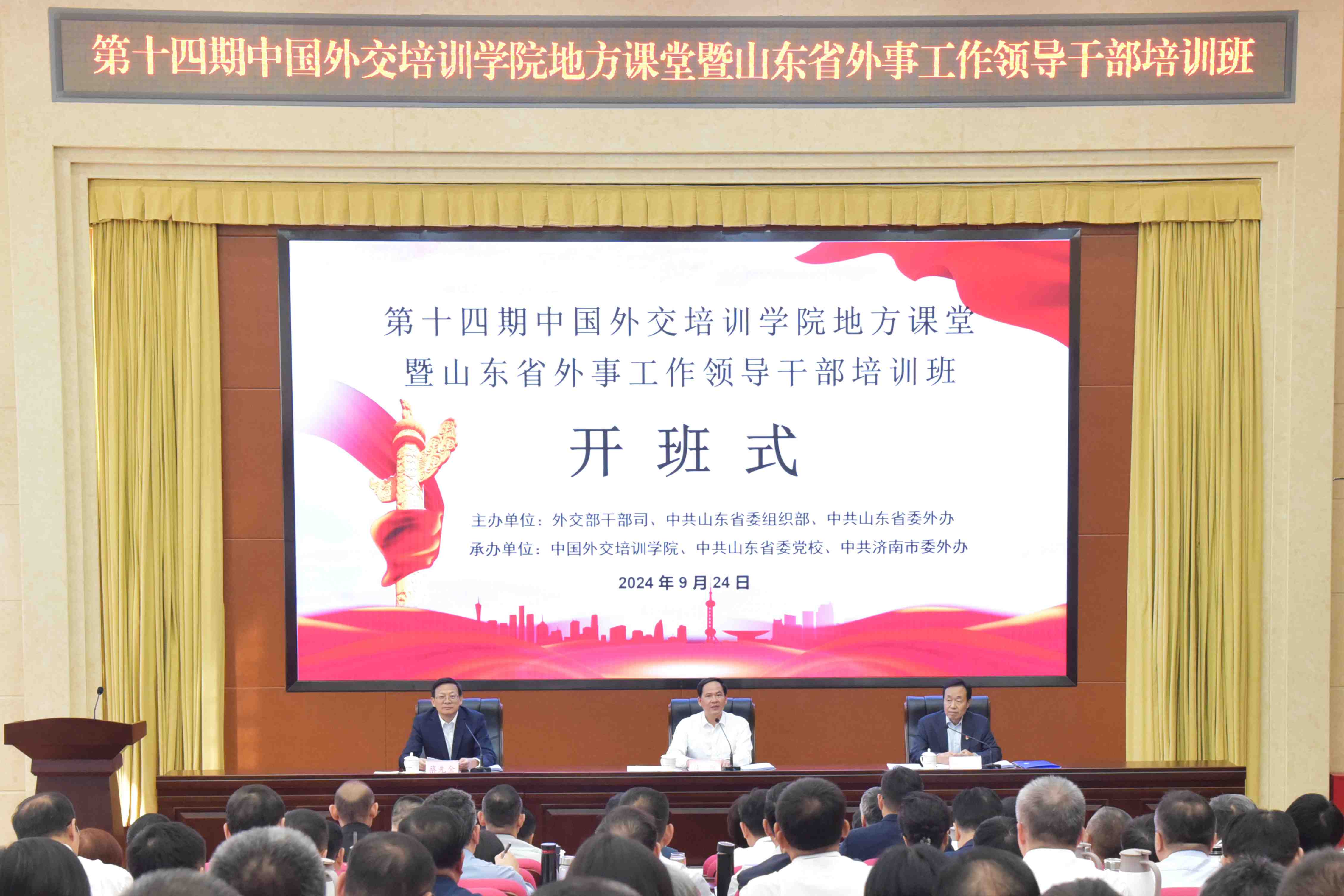 9月23日至9月26日,第十四期“中国外交培训学院地方课堂暨山东省外事工作领导干部培训班”在山东省济南市成功举办。本期地方课堂由外交部干部司、中共山东省委组织部、山东省委外办联合主办,中国外交培训学院、中共山东省委党校(省行政学院)、济南市委外办承办。山东省副省长温暖、beat365官方网站党委书记兼中国外交培训学院常务副院长王世廷出席开班式并讲话,山东省委外办主任兼省对外友协会长蔡先金主持,省委组织部副部长龚文东、省委党校副校长殷玉平等出席。中国外交培训学院副院长谢粤、省委外办副主任兼对外友协常务副会长陈白薇出席结业式并为学员颁发结业证书。