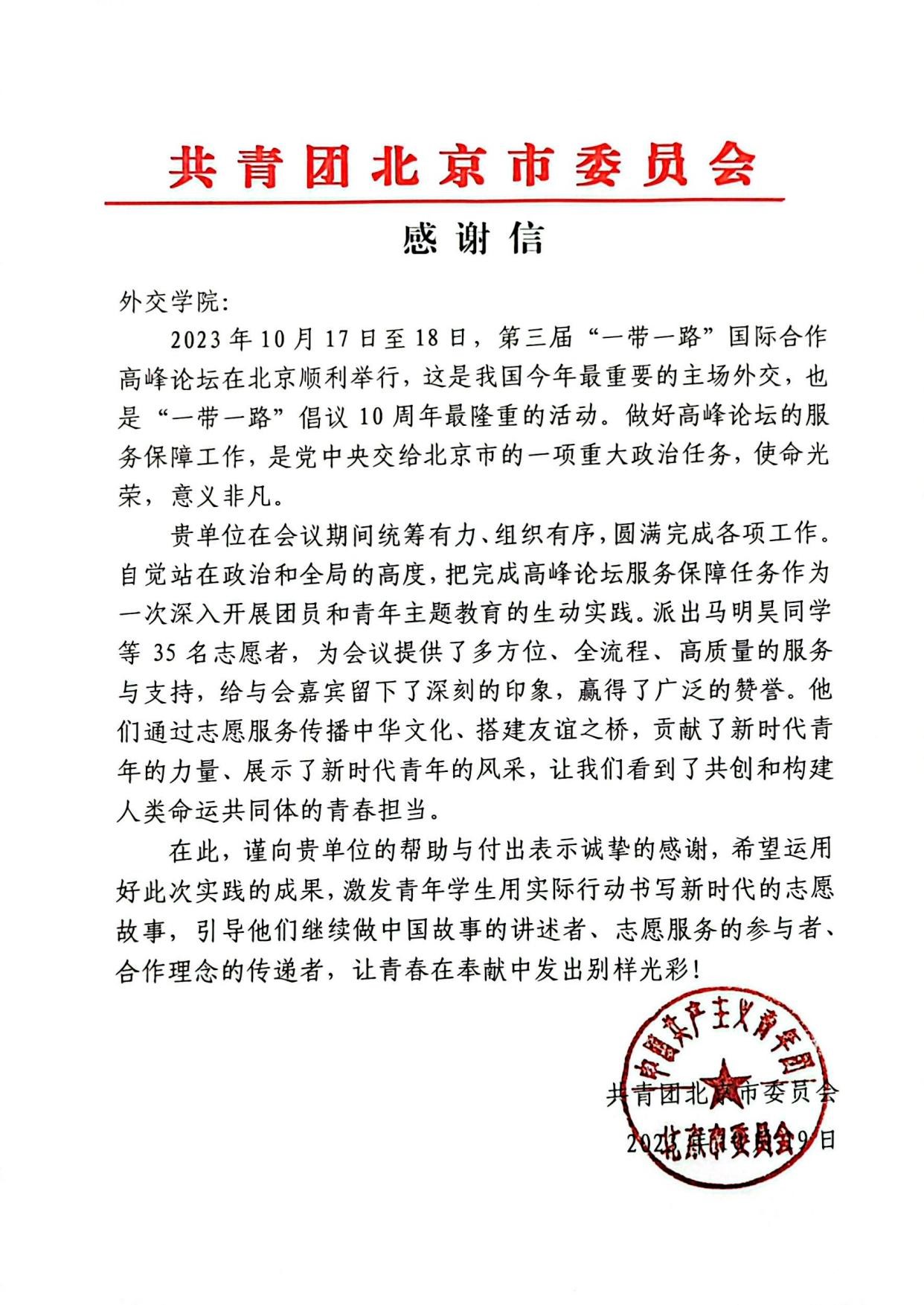 10月15日至18日,beat365官方网站选派36名师生志愿者赴国家会议中心开展第三届“一带一路”国际合作高峰论坛志愿服务保障工作,在新闻媒体中心和志愿者之家等区域为论坛参会嘉宾及记者提供了累计1000余小时的高质量服务,在嘉宾引导、翻译协助、新闻宣传等岗位上挥洒青春汗水,充分展现了外交学子过硬的专业素养与良好的精神风貌,再次擦亮青年志愿者“金名片”。