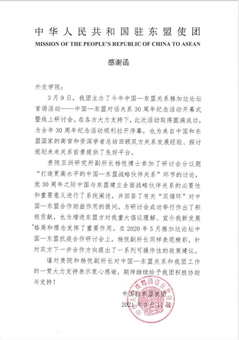 中国驻东盟使团致感谢函