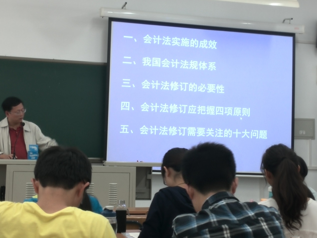 王鹏处长是国内多个会计准则的起草人,也是7月份刚刚启动的《中华人民共和国会计法》修订工作的主要参与人。在此次讲座中,王鹏处长以扎实的理论基础和丰富的工作经验讲解了《会计法》自1985年发布实施以来,历经1993年和1999年两次修订,在规范会计行为、提高会计信息质量、维护市场经济秩序、推进法治社会建设等方面所发挥的重要作用;以及随着我国经济的深入发展和经济全球化进程的不断加快,《会计法》在规范会计活动、会计工作中出现的一些新问题,比如如何保障《会计法》的强制力,如何确定《会计法》的边界,如何确立《会计法》法律定位,如何解决会计责任与权利匹配的问题,如何解决国际上对中国会计信息质量的信任问题,如何解决《会计法》与《公司法》、《证券法》、《税收征收管理法》等相关法律以及与现行企业会计准则的协调问题等。
