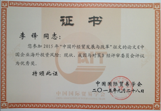 国经学院李锋老师参加“中国外经贸发展与改革”专题征文活动喜获优秀奖