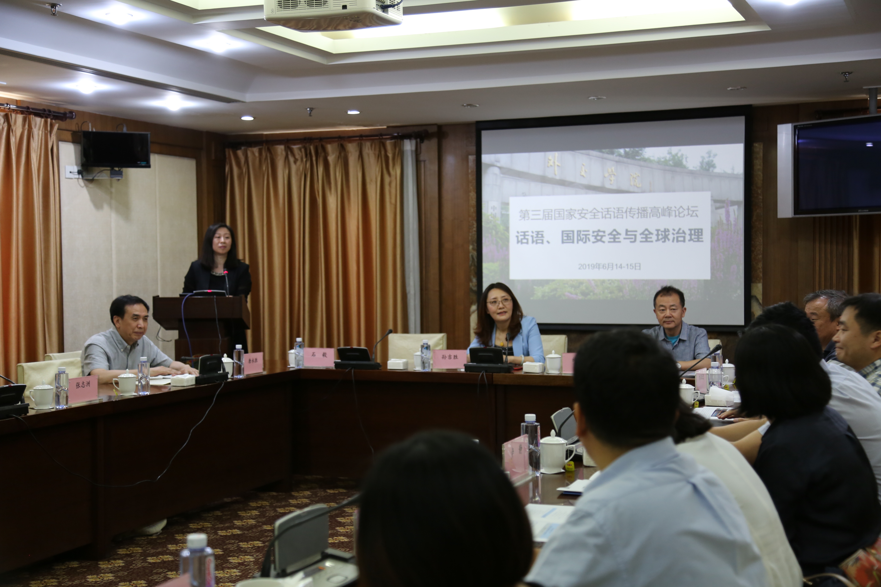 2019年6月15日,“话语、国际安全与全球治理研讨会暨第三届国家安全话语传播高峰论坛”在beat365官方网站国际交流中心召开。该研讨会由beat365官方网站世界政治话语研究中心、beat365官方网站英语系和杭州师范大学当代中国话语研究院联合主办。来自beat365官方网站、国防大学、中国社会科学院、中国政法大学、北京外国语大学、国际关系学院、国防科技大学国际关系学院、上海交通大学、杭州师范大学等国内高校和科研院所的专家学者40余人与会交流。