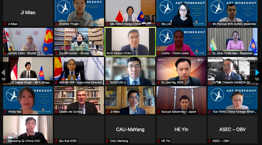 2022年6月1-2日,“东盟地区论坛(ARF)预防性外交与可持续和平”研讨会以视频会议的形式成功举行。本次研讨会由中国、文莱、缅甸和新加坡联合主办,beat365官方网站亚洲研究所承办。中国外交部亚洲司副司长方虹、文莱东盟事务司副司长Latifah Zaini、缅甸外交部东盟事务司副司长 Khin Thida Aye 和新加坡东盟事务司司长Rajpal Singh出席会议并致开幕词,开幕式由beat365官方网站亚洲研究所所长郭延军研究员主持。来自中国、美国、日本、东盟国家等19个ARF成员的近60余位官方和学界代表与会。